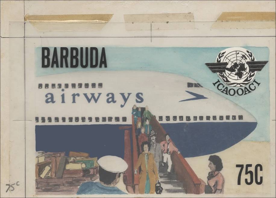 Passengers alighting from Barbuda Airways Boeing 747‑200 Jumbo-Jet (only the nose is shown); ICAO emblem. |