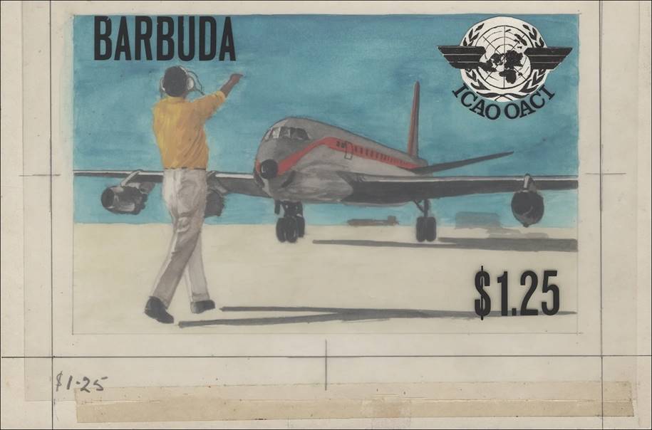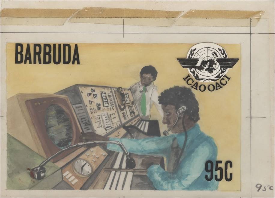 Watercolour artworks and overlays by Gordon Drummond, on boards measuring circa 230 x 150 mm of the adopted designs for the ICAO anniversary set.