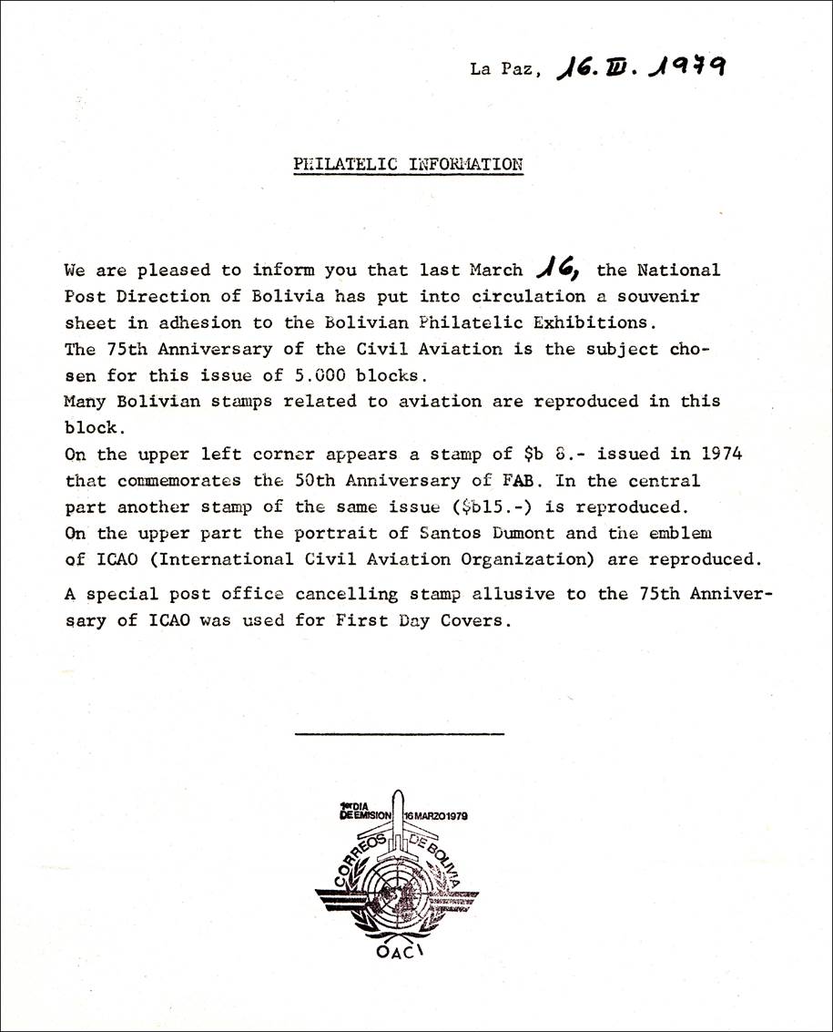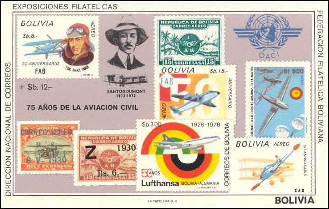 Souvenir sheet with theme: Aviation history commemorating the 75th anniversary of the first engine‑powered flight of Wright Brothers and the 30th anniversary of ICAO. It was issued under the auspices of the Bolivian Philatelic Federation, which held various philatelic exhibitions in Bolivia in 1979. The text on the sheet reads: 75 AÑOS DE LA AVIACION CIVIL (75TH ANNIVERSARY OF CIVIL AVIATION). Picture of Santos-Dumont with the dates 1873-1973 (centenary of birth) and his biplane 14-bis; ICAO emblem. Eight Bolivian rare stamps related to aviation are reproduced on this block, as described hereafter. 5,000 copies were produced. |