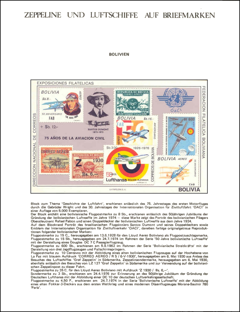 a) 10-Centavo stamp overprinted on 6 May 1930 in commemoration of the Europe-Pan America flight of the airship Graf Zeppelin with: "CORREO AERO/R.S./6‑V‑1930" (in azure-blue). The original stamp was issued in December 1924 for the establishment of the National Aviation School in La Paz; the aircraft is a Morane Saulnier Type P; b) 35-Sobretasa stamp overprinted and surcharged on 6 May 1930 with: "Z/1930/Bs. 6.‑" (in black), in commemoration of the connection service to the airship Graf Zeppelin. The original stamp was issued on 13 June 1928 to pay tribute to the Lloyd Aero Boliviano airline (with its coat of arms depicted on the stamp), founded on 15 September 1925; c) 3-Sobretasa stamp issued on 24 April 1976 commemorating the 50th anniversary of Lufthansa (1926‑1976). It shows a DC-10 airliner of the Lufthansa air company, and the Bolivian and German national colours; d) 4.50-P stamp issued on 24 July 1974 for the 50th anniversary of the Bolivian Air Force (Triplane trainer Fokker in the background used during the WWI and Morane Saulnier M.S. 760 Paris I airplane).
