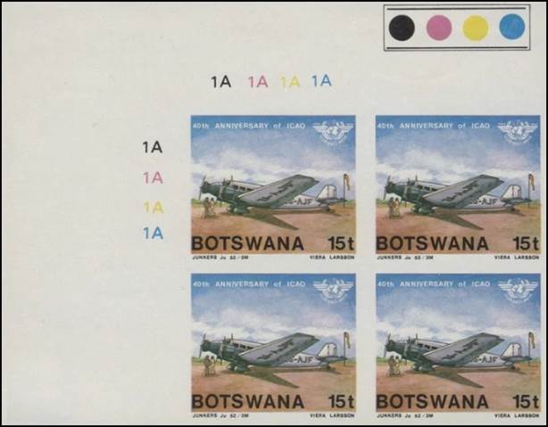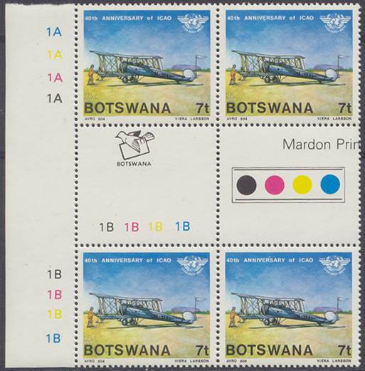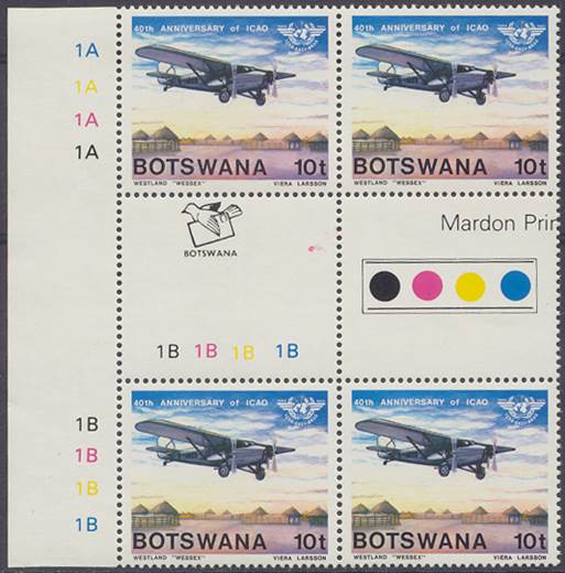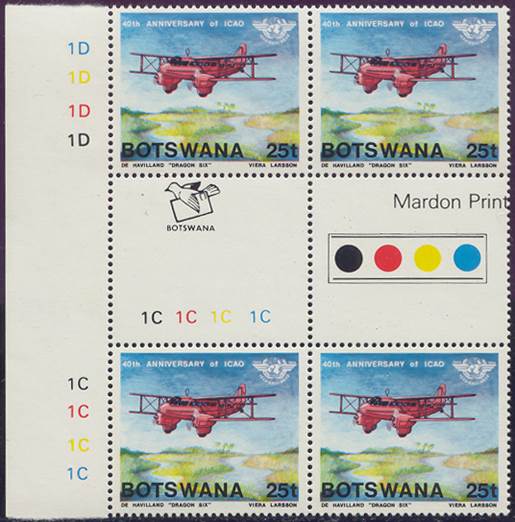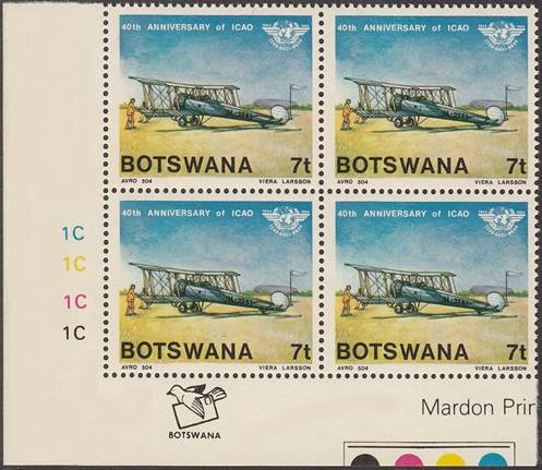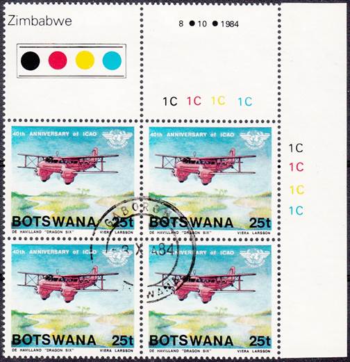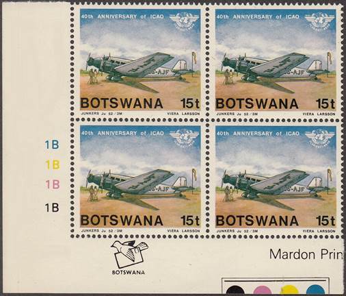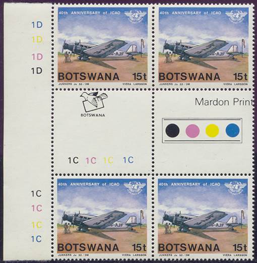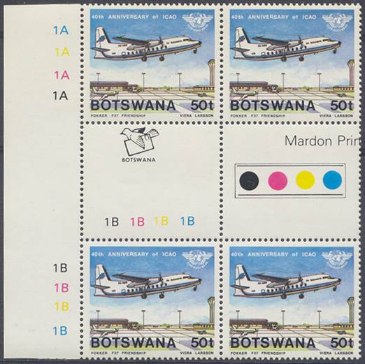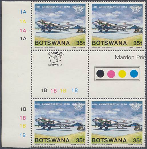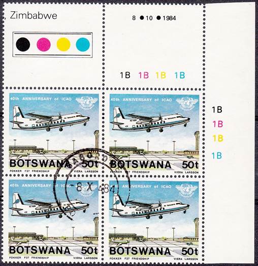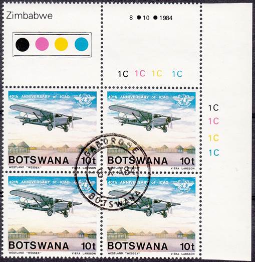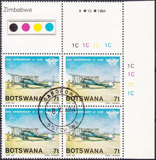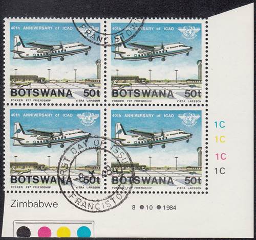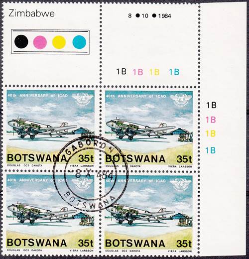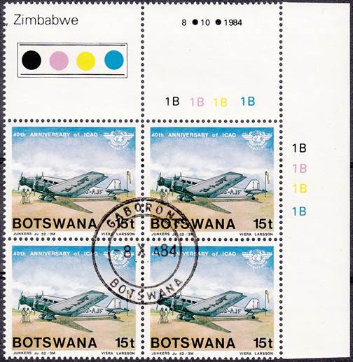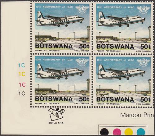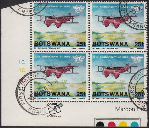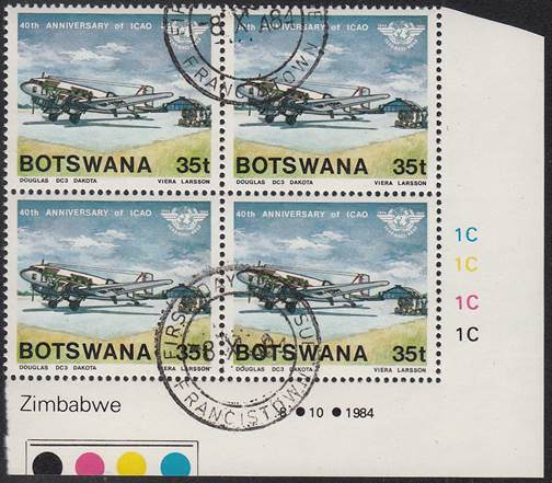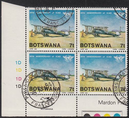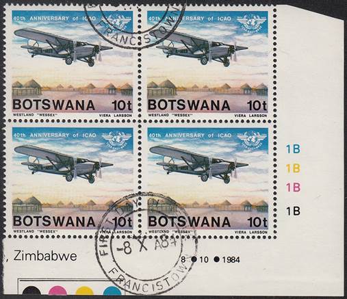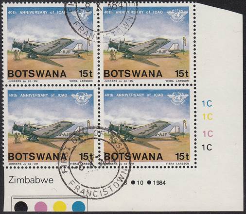 Lower-left blocks of 4 stamps, Cancelled to Order (CTO) at Francistown, with the date of issue printed in the lower margin. Francistown is the second largest city in Botswana. |