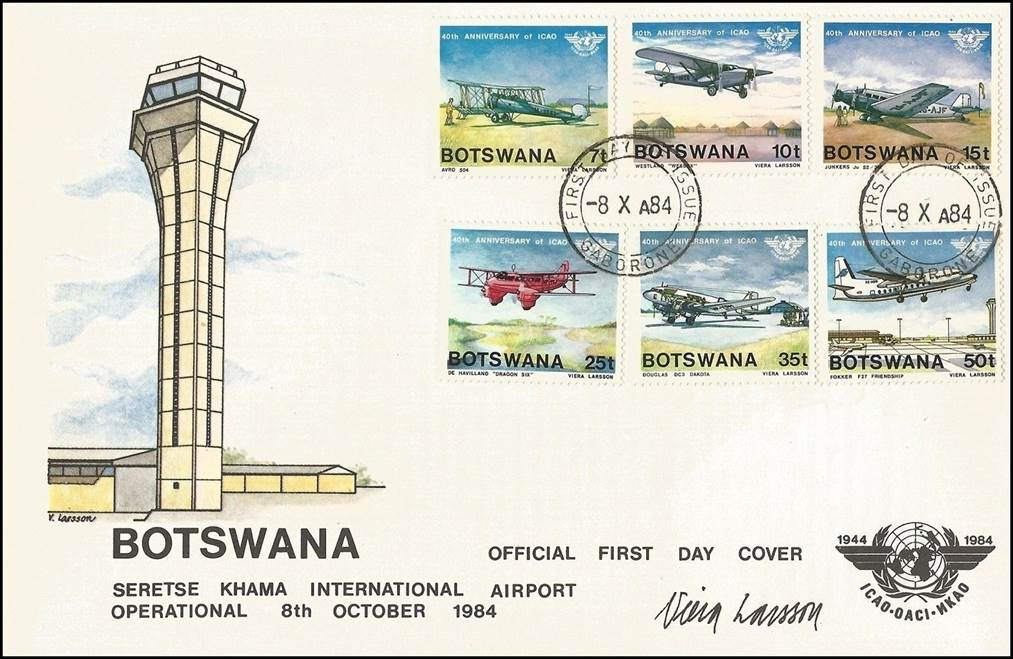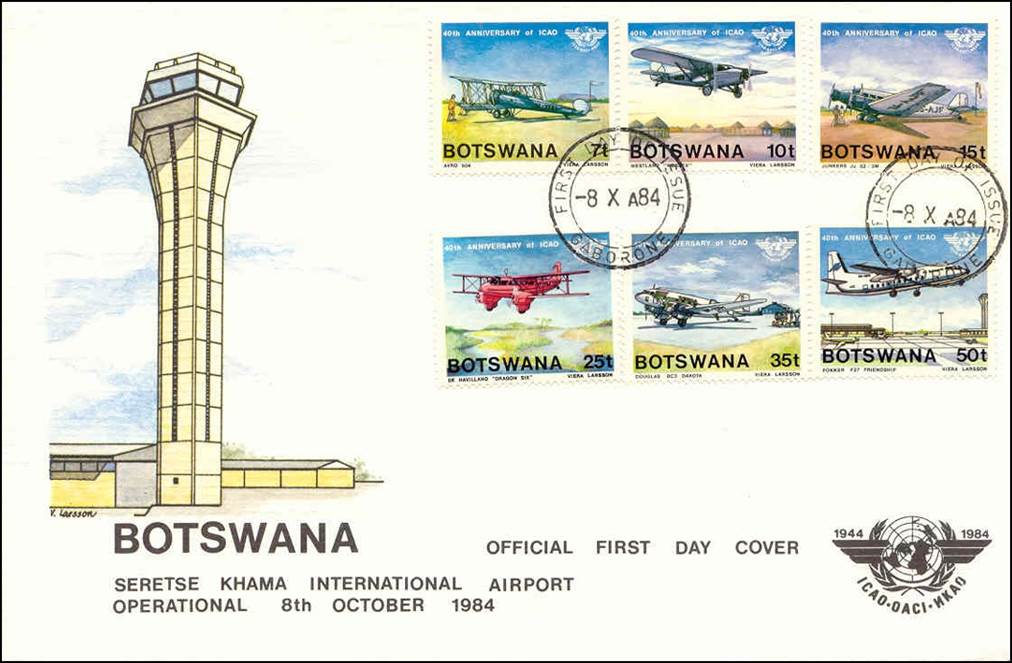 Official First Day Cover. The illustration, designed by Viera Larsson, commemorates the first operational day (8 October 1984) of Sir Seretse Khama International Airport, Gaborone, Botswana. Seretse Khama was the first president of Botswana (1966–1980), after the former Bechuanaland protectorate gained independence from Great Britain in 1966; his name means the clay that binds together.