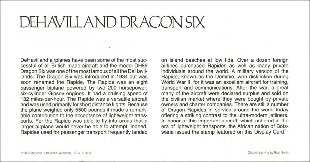 Painting by Basil Smith, based on the 25-thebe stamp (de Havilland Dragon Six). Aircraft registration number: G-ACTT (de Havilland DH-89A Dragon Rapide) in Great Britain. Designer and Painter, Basil Smith was born in 1925 in Hove, Sussex, England. The painting was printed in the form of postcards whose back provides a complete history of the de Havilland Dragon Six. Being the first British monarch to fly, King Edward VIII purchased in 1935 two Dragon Rapide biplane registered with the British civil markings G-ACTT and G-ADDD respectively. The actual aircraft were decorated externally in the scarlet and blue of the Brigade of Guards; the wings were silver. In the ICAO collection, another Smith’s painting can be found at the following link: Sierra Leone - 1985 - 40th Anniversary of ICAO.