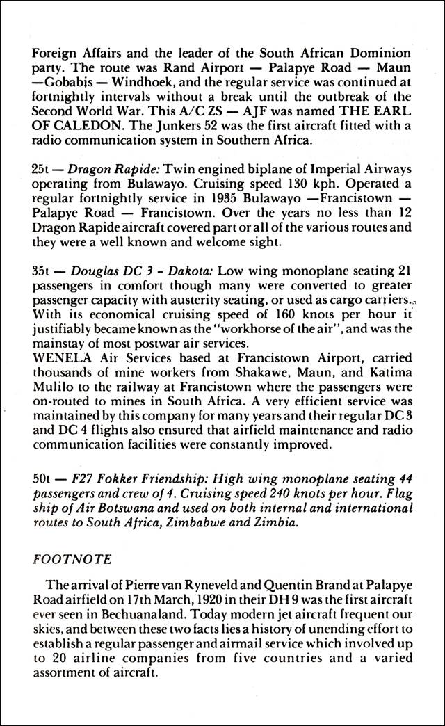 In 1935, this aircraft operated a regular fortnightly service on the route Bulawayo – Francistown – Palapye – Francistown. Over the years, no less than 12 Dragon Rapide aircraft covered part or all of the various routes; they were a well-known and welcome sight.