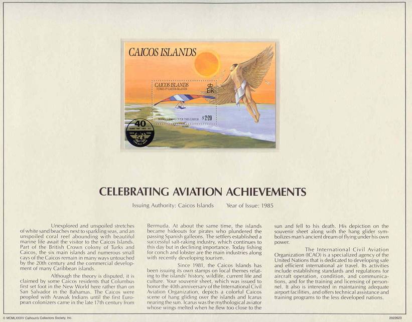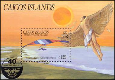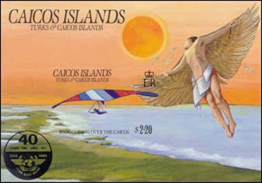 Hang‑glider over the Caicos. Icarus flying over Caicos Islands towards the sun and losing his wings; ICAO 40th anniversary emblem. |