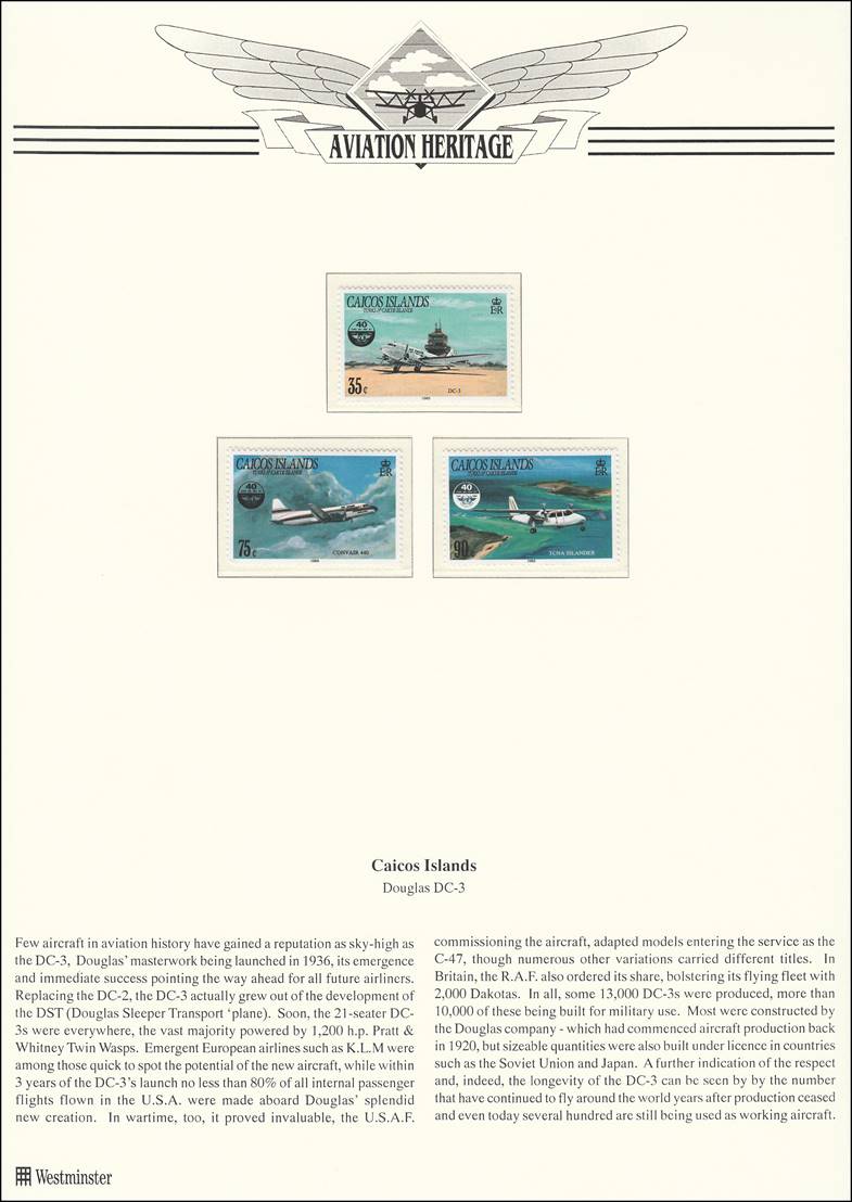 Album pages with detailed information from The Aviation Heritage Collection produced by Westminster. This collection of stamps presents a flypast of history's legendary aircraft, all detailed on genuine Official Postage Stamps from the country concerned.