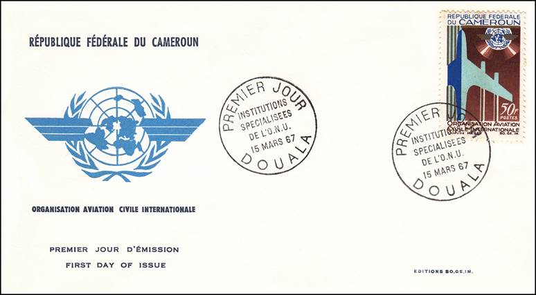 First Day Cover. Editor: SO.GE.IM. Errors in the ICAO emblem: 1. The ICAO logo must include four concentric circles. The design on this cover displays only three circles. The correct ICAO emblem is shown at the opposite left. 2. 3. "de l'" is missing in the French name of the Organization. Should be Organisation de l’aviation civile internationale.