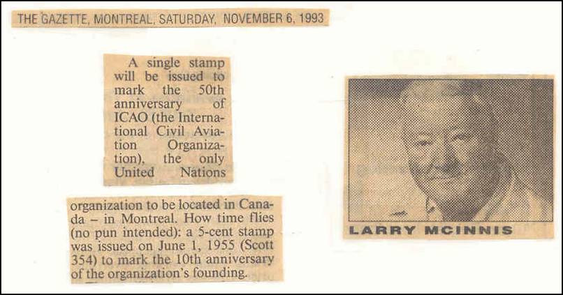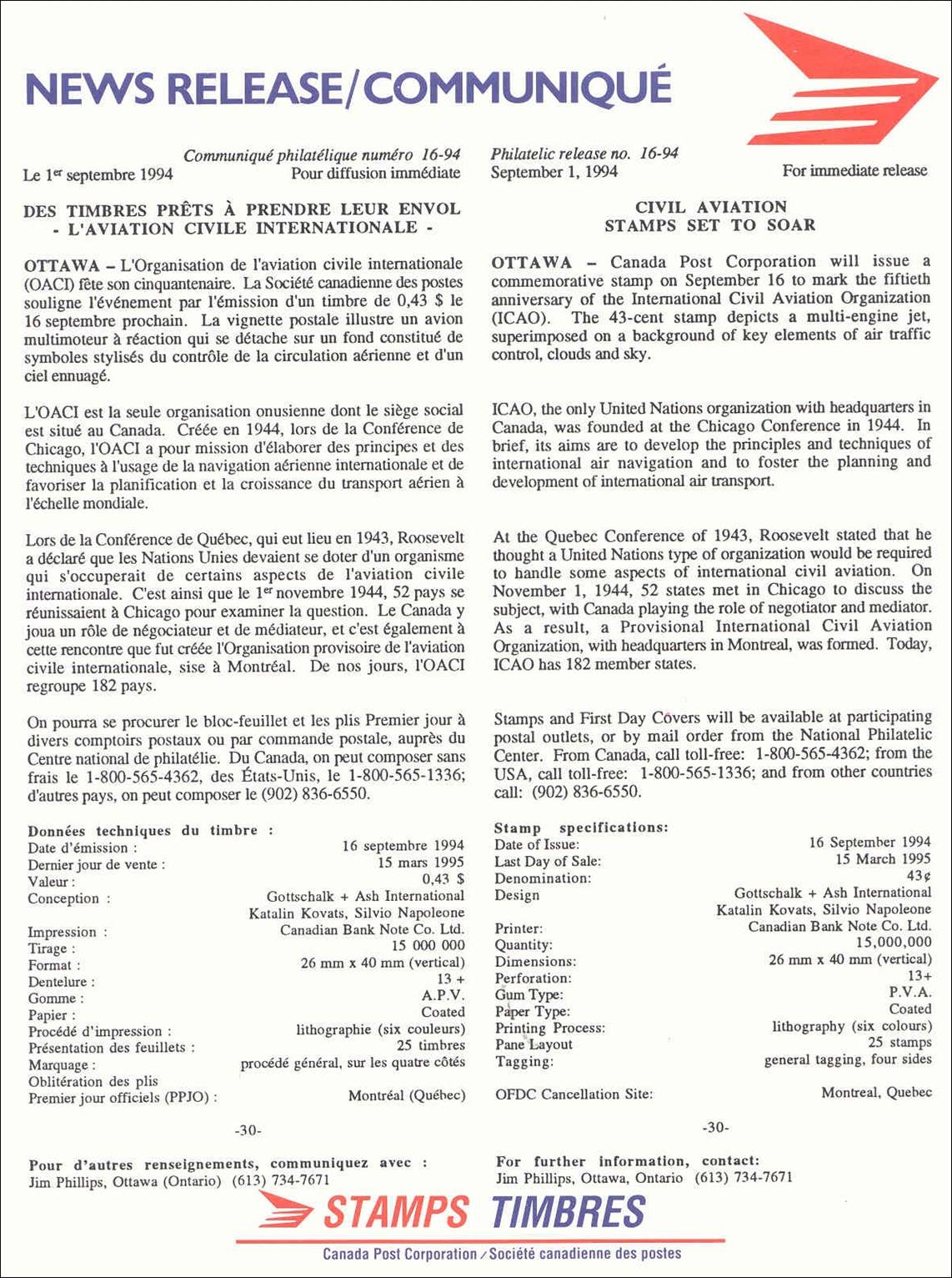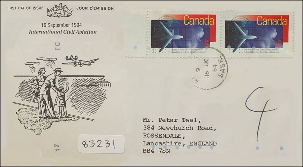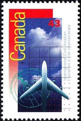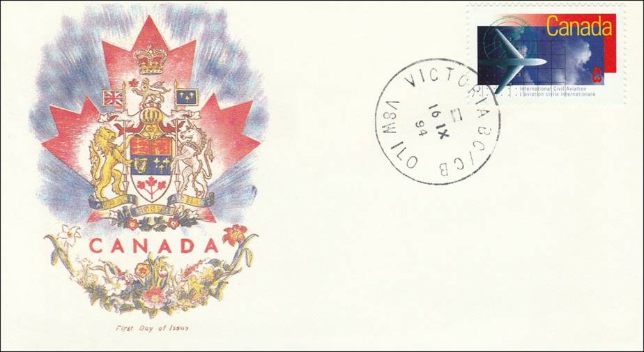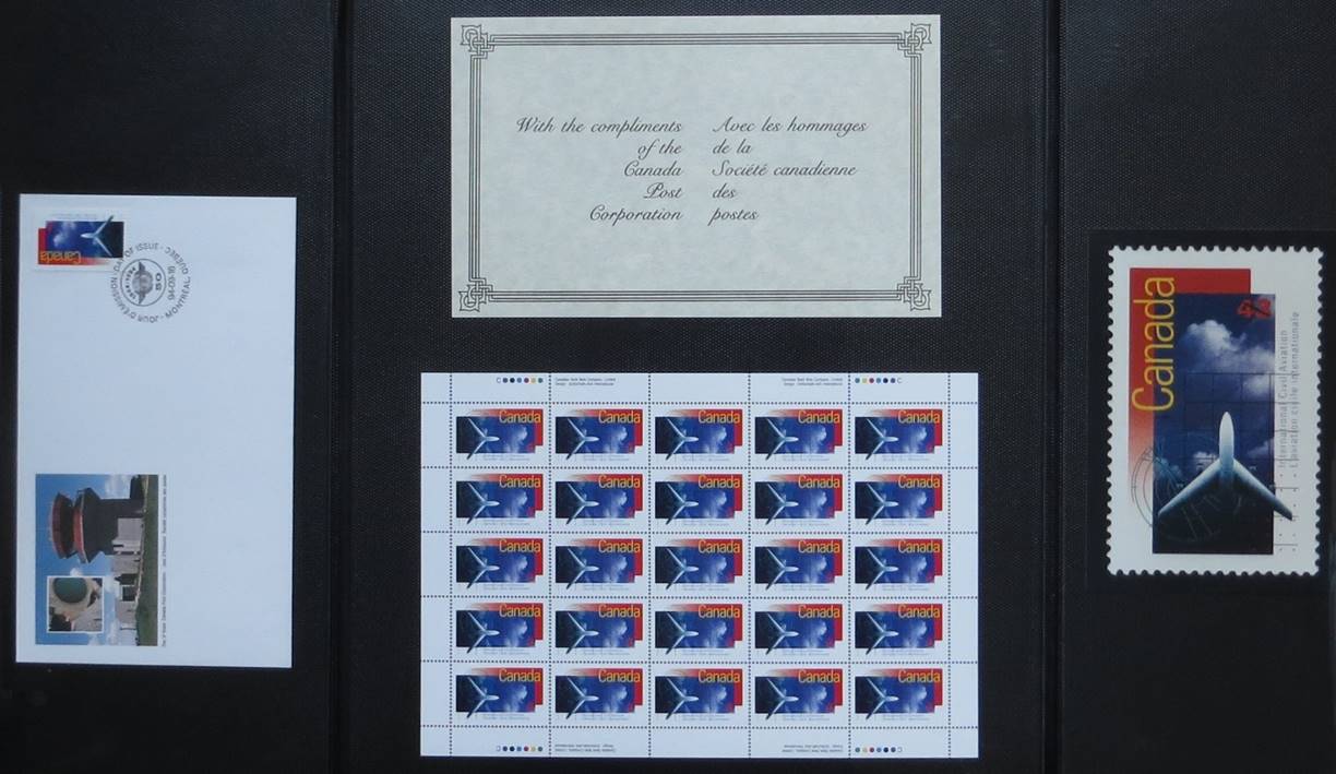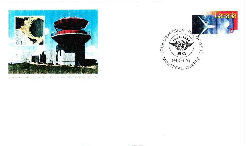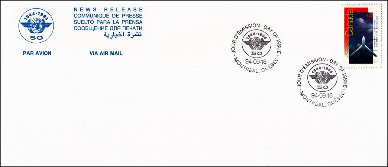 Background: The Canada Post Corporation (CPC) left much confusion in the actual reason of this issue. Although the stamp vertically indicates International Civil Aviation and L’aviation civile internationale, philatelic notices mention the commemoration of the 50th anniversary of the International Civil Aviation Organization (ICAO), which was clearly the intention of the CPC as reported by the local press too. The first day ceremony (unveiling of the Canadian stamp and opening of ICAO’s three-day stamp exhibition) was held at ICAO’s Sherbrooke Street headquarters on 16 September 1994 at 10h30. See more details on the stamp exhibition by clicking on the following link: Philatelic Exhibition on Aviation (1994). Note the vertical layout of this stamp (with the value printed horizontally), whereas some early documents (see above first day cover) from the CPC show this stamp in landscape format.