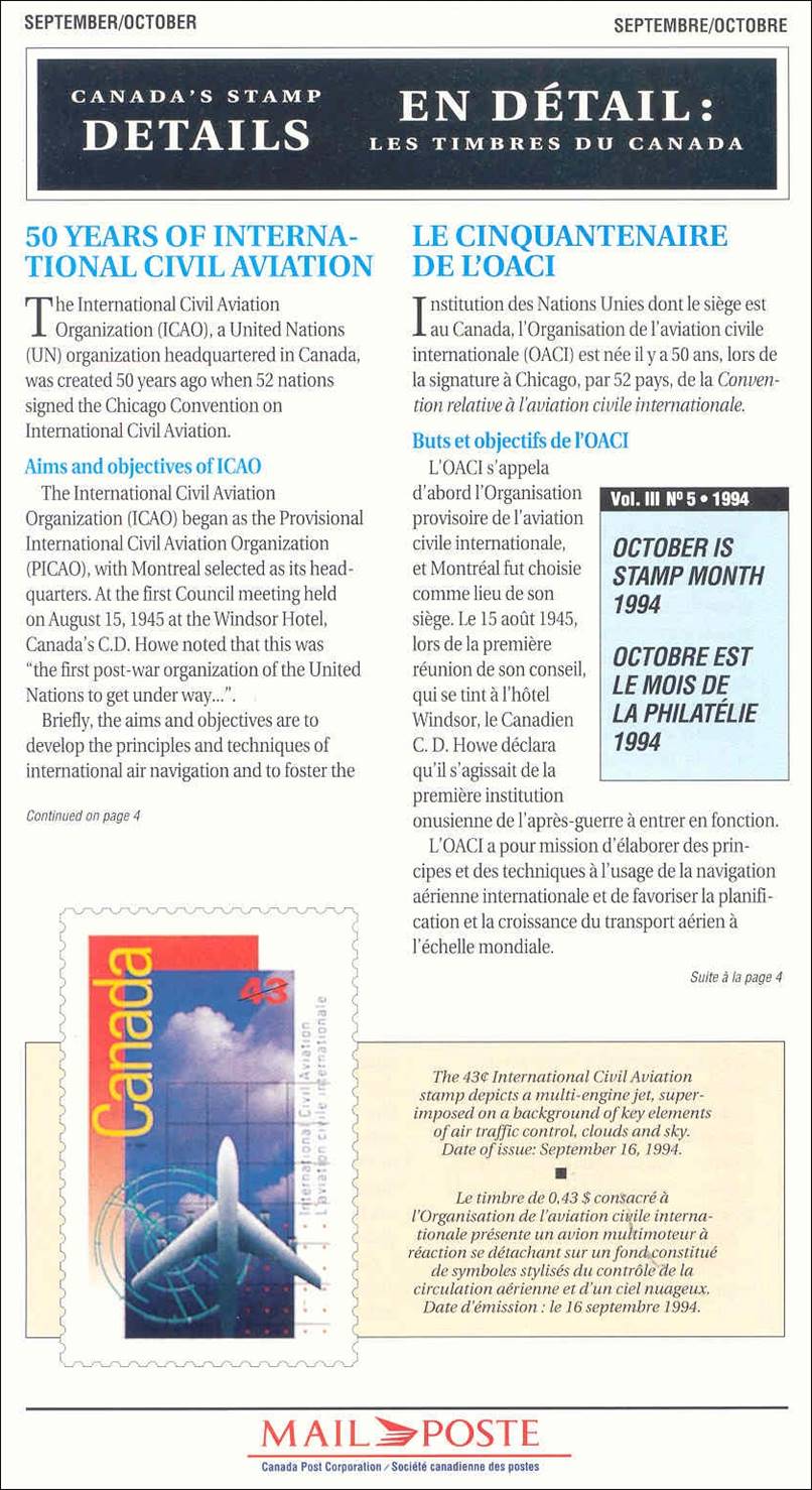 1994 Canada Year Set or Collection of the Postage Stamps issued by Canada in 1994. Only the pages related to ICAO are reproduced hereafter.