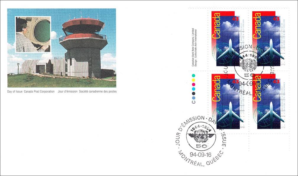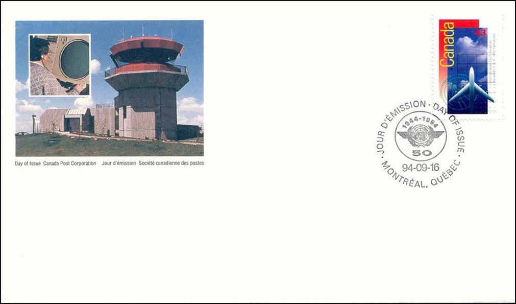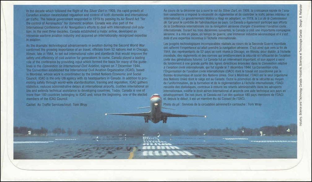 First Day Cover, designed by Bernard N.J. Reilander; cachet showing Air Traffic Services; inset photo of the cachet by Tom Wray; additional bilingual text and photo on the back of the cover. The cachet complements the stamp by depicting the modern airport tower located at Saint-Hubert, Province of Québec, Canada.