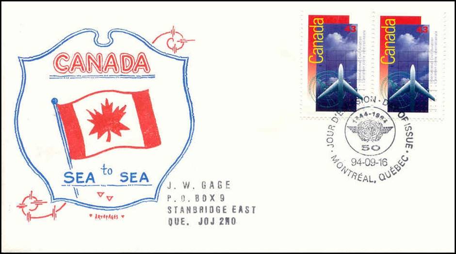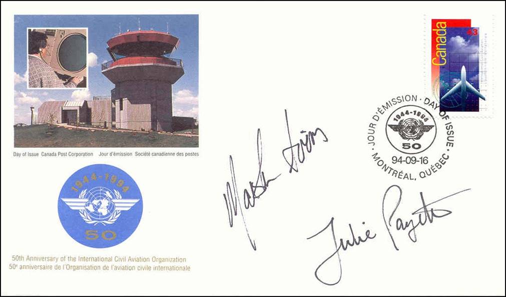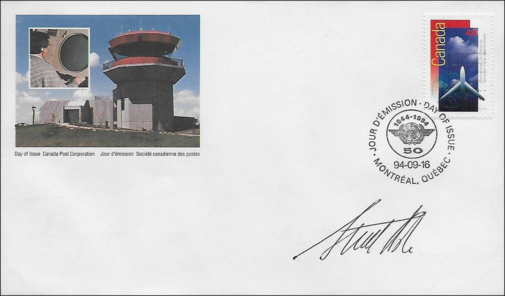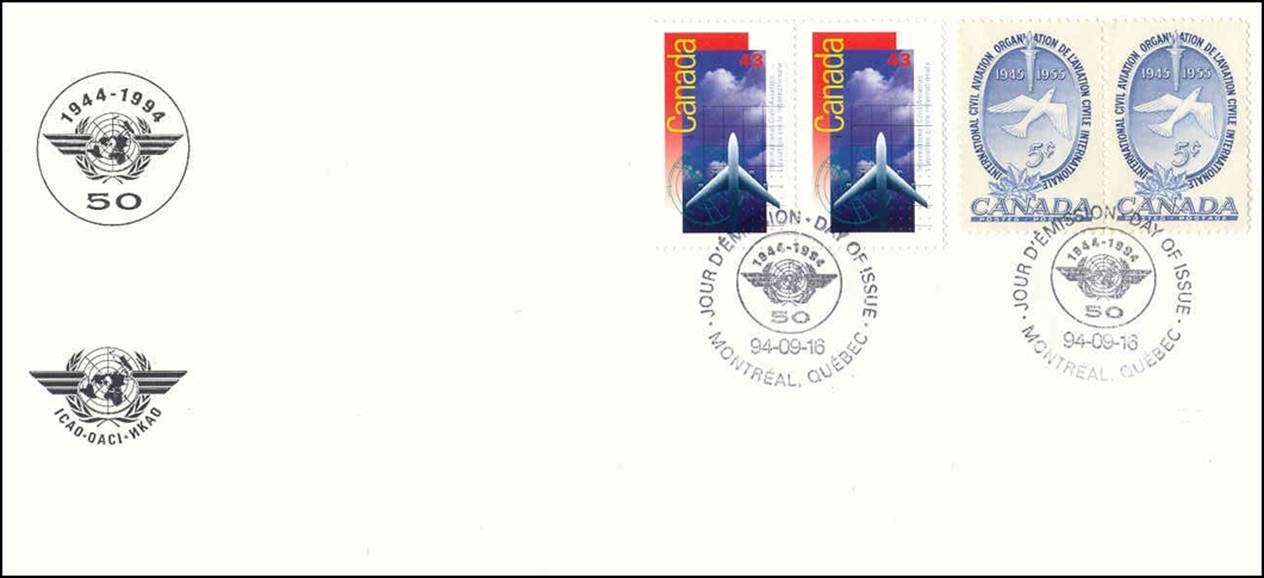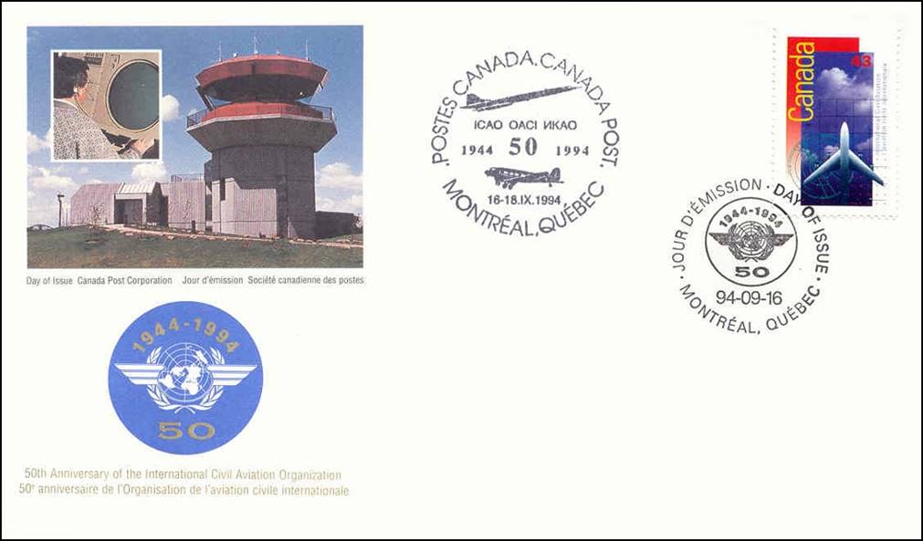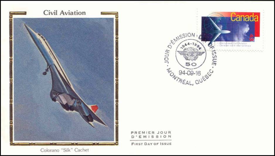 First Day Cover with special cancellation of the Philatelic Exhibition on Aviation (16-18 September 1994), held on the premises of ICAO headquarters in Montreal for the 50th anniversary of ICAO. The cancel shows a Concorde and a Douglas DC-3.