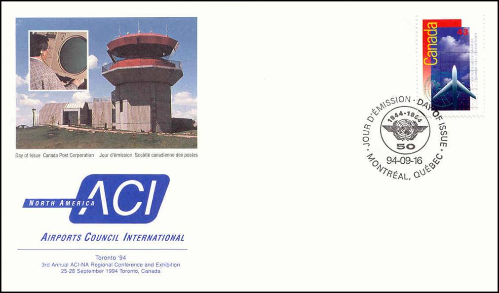 The official first day cover was overprinted with the emblem of the Airports Council International (ACI) of North America (NA), on the occasion of the 3rd Annual ACI-NA Regional Conference and Exhibition, held in Toronto, Canada, from 25 to 28 September 1994. This overprinted cover was made available to the participants at the conference.