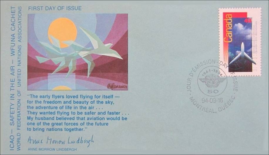 First Day Cover. In recognition of Charles A. Lindbergh as a pioneer in civil aviation and in confirmation of his belief in its future, the words of Anne Morrow Lindbergh and the artistry of Ole Hamann from Denmark have been combined on the cover to create a meaningful and artistic record of the theme of this stamp issue Safety in the Air. The artwork incorporates a quotation, signed on the plate by Anne Morrow Lindbergh, under a striking painting by Ole Hamann showing a bird in flight, with several shades of blue enhanced by a lighter blue background and a blue lettering. Ole Hamann was the third Chief, United Nations Postal Administration. The quotation on the front of the cover is from Anne Morrow Lindbergh’s response on behalf of her late husband, to the presentation of the Edward Warner Award from ICAO on 6 November 1975: The early flyers loved flying for itself – for the freedom and beauty of the sky, the adventure of life in the air … They wanted flying to be safer and faster … My husband believed that aviation would be one of the great forces of the future to bring nations together.