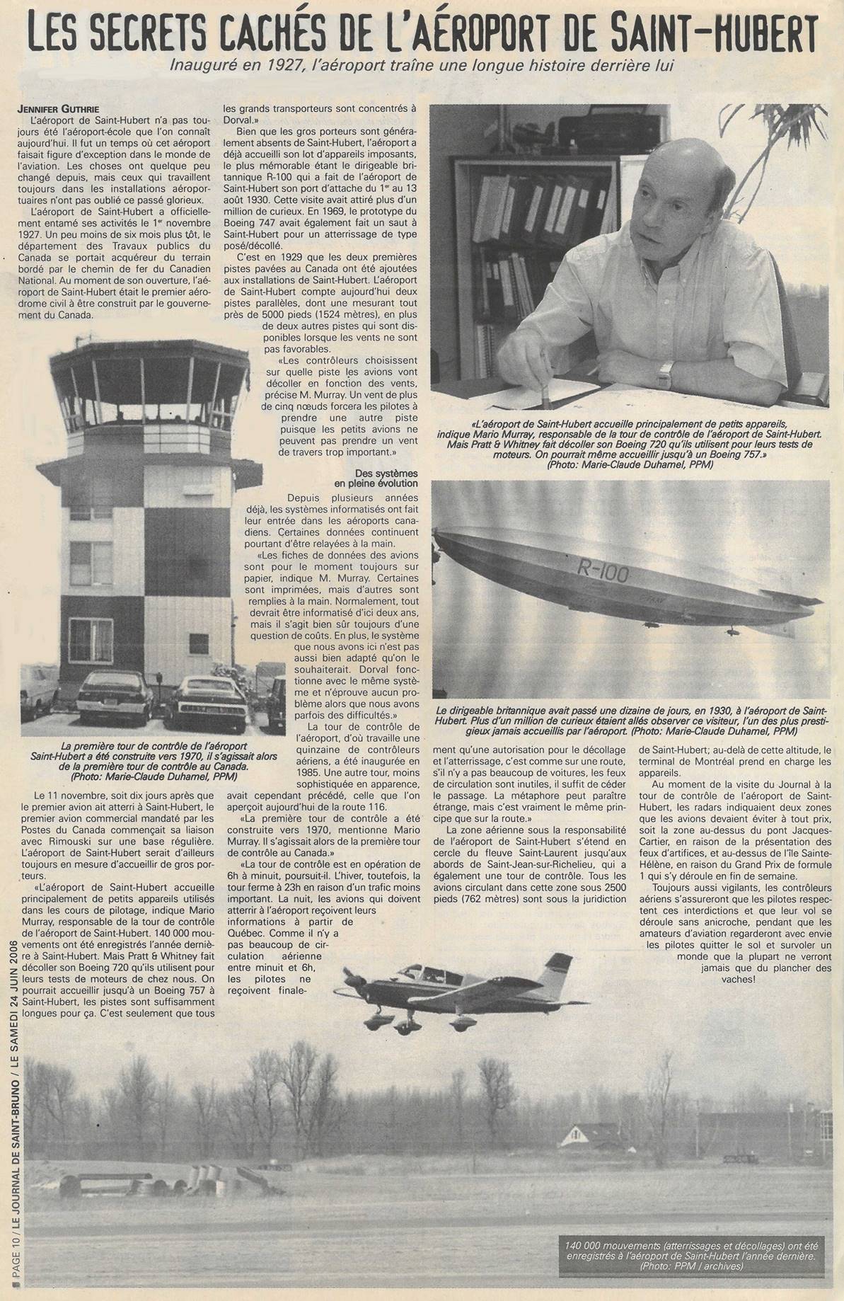 On 1 October 1928, the Saint-Hubert airport became the Canadian base for the country's first air route to the United States, served by Colonial Airways. Departing from Cardington, UK on 28 July 1930, the R-100 airship (registered G-FAAV), piloted by Captain Ralph Sleigh Booth, arrived in Saint-Hubert on 1 August on its inaugural transatlantic flight, attracting over a million visitors between 1 and 13 August 1930. There were no other flights. In October of that year, another British airship, the R-101, on its way from Britain to the Indies, was tragically destroyed in France. The airship project was dead. The only legacy this unfortunate project left Canada, and it was important, was a fully equipped airport, within reach of Montreal and capable of receiving air traffic in all weather conditions. The mast was demolished in 1938. In 1936, the newly created Department of Transport became the owner of the airport. Two years later, Trans-Canada Airlines (now Air Canada) made Saint-Hubert Airport its regional airbase, operating its first transatlantic flights from there with Lockheed L-10 Electra aircraft. On 13 April 1939, Canada's first control tower was officially opened at Saint-Hubert (see picture on the opposite left). In 1938, the anchor mast was destroyed, as it became obsolete due the abandonment of airships and thus was considered dangerous for air traffic.