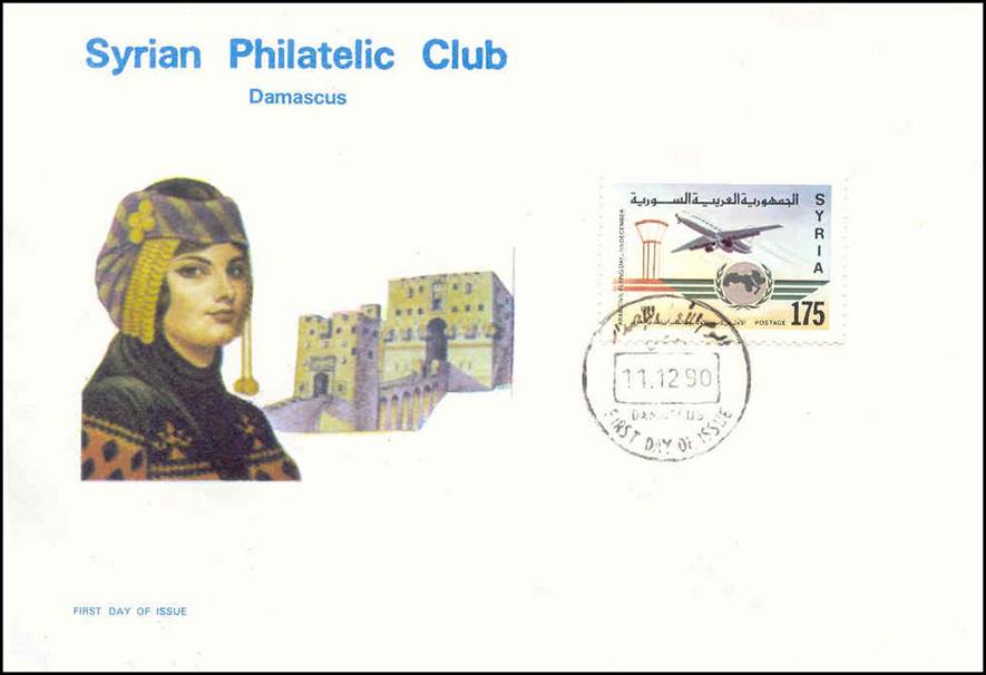 11 December 1990 – Syria - Arab Civil Aviation Day Note that the vertical text on the left-side reads as follows: ARAB CIVIL FLYING DAY – 1th DECEMBER; it should be spelled: ARAB CIVIL AVIATION DAY – 1st DECEMBER. Design and date errors are combined on this issue. |