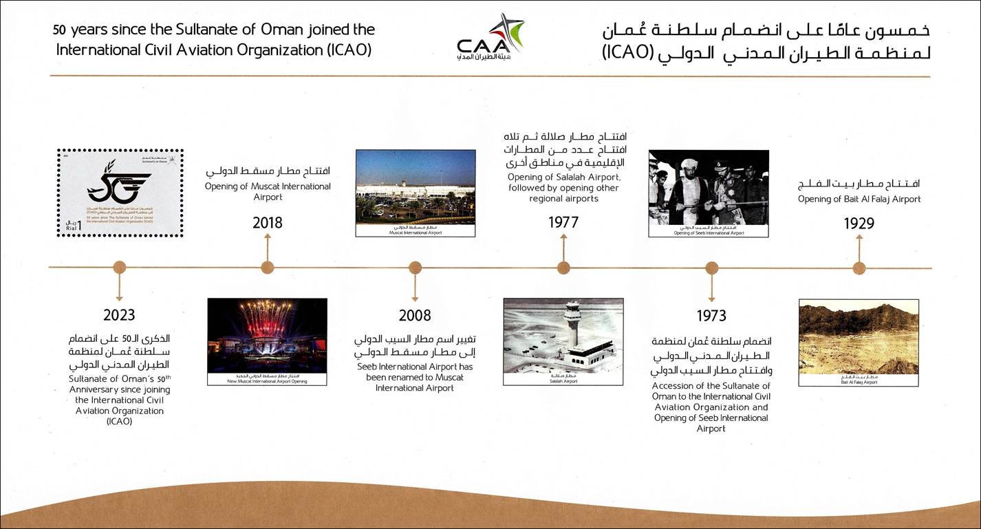 Further to the 50th anniversary of Oman’s adherence to the ICAO Convention on International Civil Aviation (Chicago Convention), Oman released on 7 December 2023 (on International Civil Aviation Day) a stamp, a souvenir sheet and a first day cover to mark this event. More information on this stamp issue can be found at the following link: Oman 50th anniversary of admission to ICAO. A sample of the minisheet of this issue is displayed hereafter; it includes the stamp and traces the history of civil aviation in the Sultanate of Oman, from 1929 to 2023,