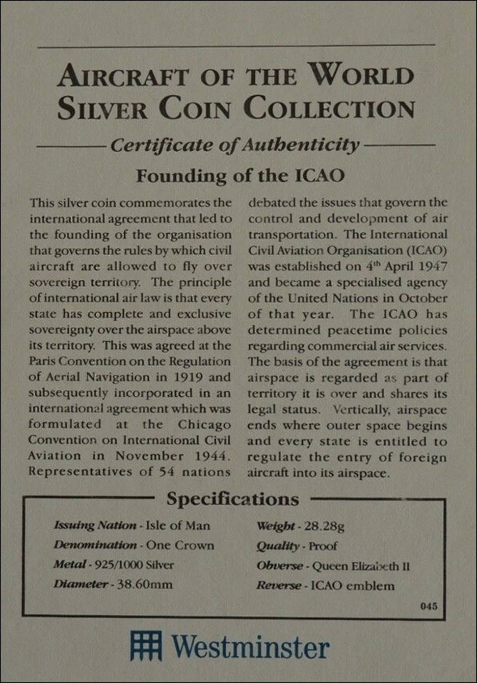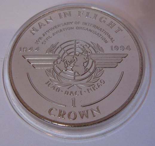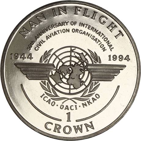 The 50th Anniversary of ICAO was commemorated by the Isle of Man with a silver proof coin of the popular Man in Flight series; it has legal tender of 1 Crown. Minted from 28.28 grams of 0.925 silvers (0.8411 oz). The diameter is 38.60 mm.