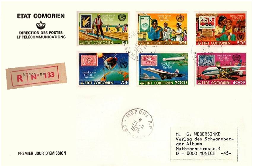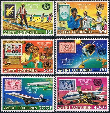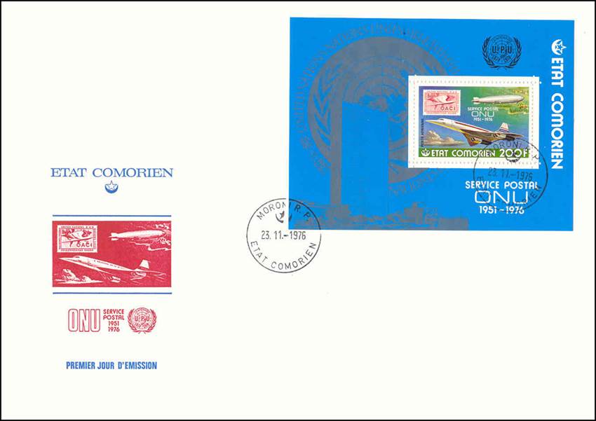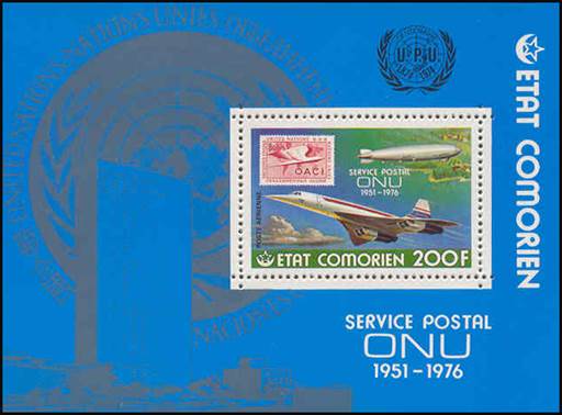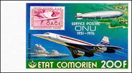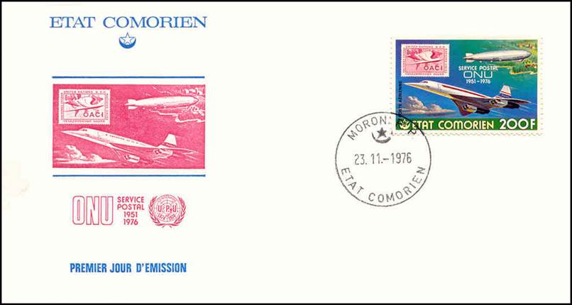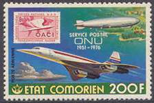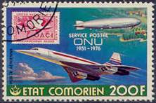 Concorde, Graf Zeppelin LZ‑127 airship over one of the islands in the Comoros archipelago, clouds and UN carmine stamp of 9 February 1955 (10th anniversary of ICAO; stamp-on-stamp). Text on three lines: SERVICE POSTAL / ONU / 1951-1976.