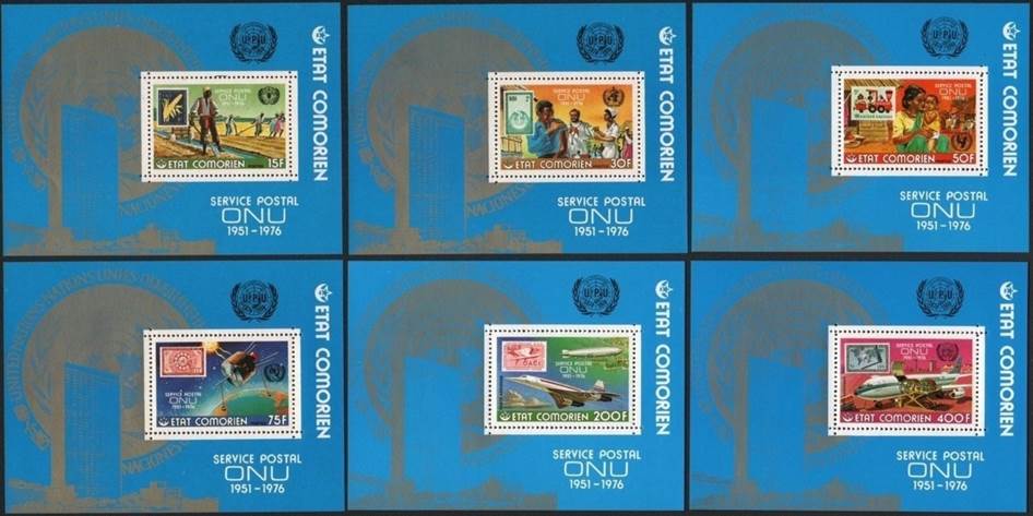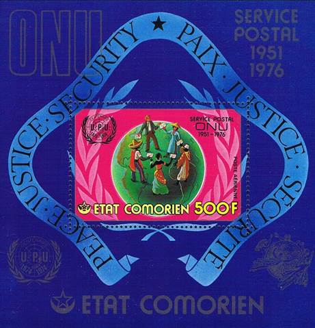 Souvenir sheet with stamp as described here above. Text on three lines: SERVICE POSTAL / ONU / 1951-1976. UN building and emblem; Universal Postal Union (UPU) emblem for its 100th anniversary celebrated in 1974. |