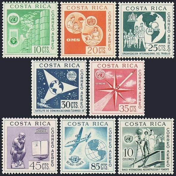 Background: The ICAO stamp is part of an issue of 8 airmail stamps and one imperforated souvenir sheet, with designs related to the UN, its Organizations and Agencies, i.e. FAO, WHO, ILO, ITU, WMO, UNESCO, ICAO, IBRD, and UNO (for the souvenir sheet).