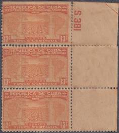 Tobacco plantation: Block of 3 stamps with plate number: S381; straight edges at top. |