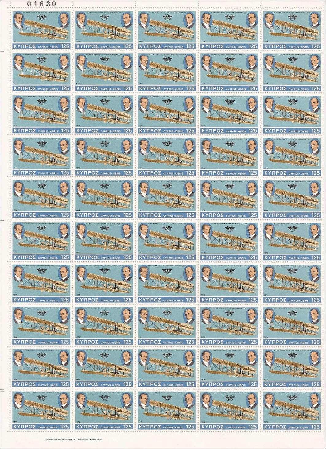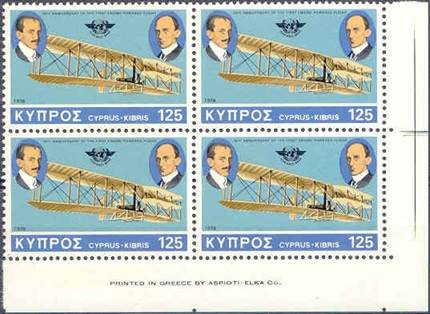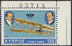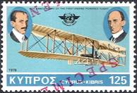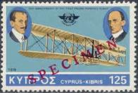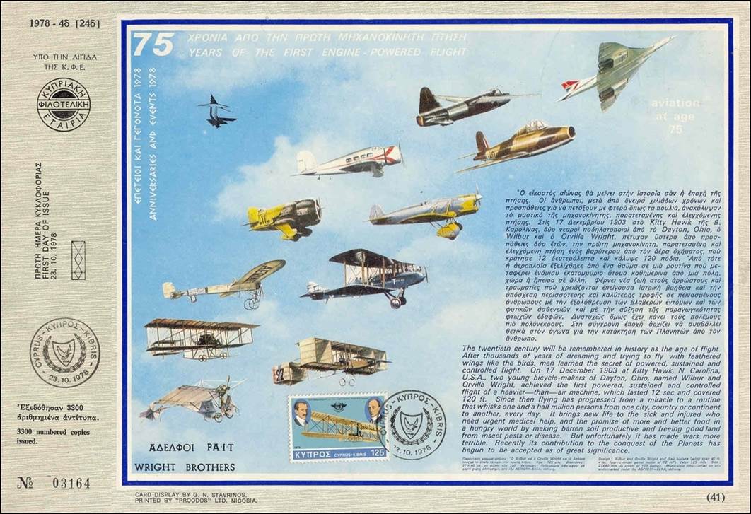 First day illustrated card. The back side of the card is blank. Issued under the auspices of Cypriot Philatelic Society. Designed by G.N. Stavrinos and printed by PROODOS Ltd, Nicosia. One mounted stamp (multicolor litho-offset by Aspiotes‑Elka Graphic Arts Inc., Athens) and postmark from the post office. Texts in English and Greek. Numbered copy (3164 of 3300 copies issued). Size: 31 x 21.5 cm. The illustration depicts the evolution of airplanes: 1. Upper row, from left to right going upwards: a. Lower left corner: Santos-Dumont Demoiselle (1907) b. Looks like a biplane Wright Model A (1908) c. Looks like a Blériot XI (1909) d. Gee-Bee Super-Sportster (1932) e. Lockheed 9 Orion (1931) f. At the top: Heinkel He 178 (1939). 2. Lower row, from left to right going upwards: a. Lower corner, just above the stamp: Voisin-Delagrange No 2 (1909) b. Looks like a de Havilland D.H.60 Moth (1928) c. Looks like a racer from the 30's d. Gloster E.28/39 (1941) e. Top right corner: Aérospace/British Aerospace Concorde (1975).