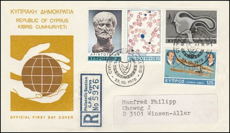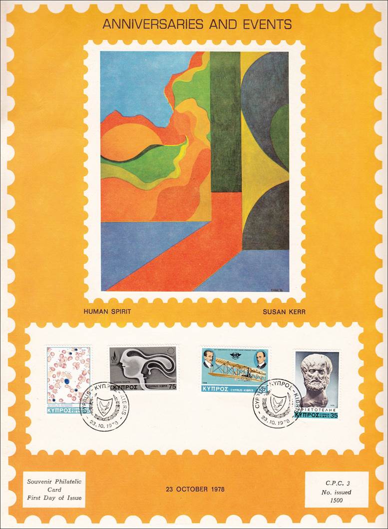 Background: This stamp is part of a set of four stamps commemorating anniversaries and events celebrated by Cyprus in 1978 (Prevention of Thalassaemia or Anemia, 2300th Birth anniversary of Aristotle, 30th Anniversary of Universal Declaration of Human Rights, and 75th Anniversary of first powered flight).