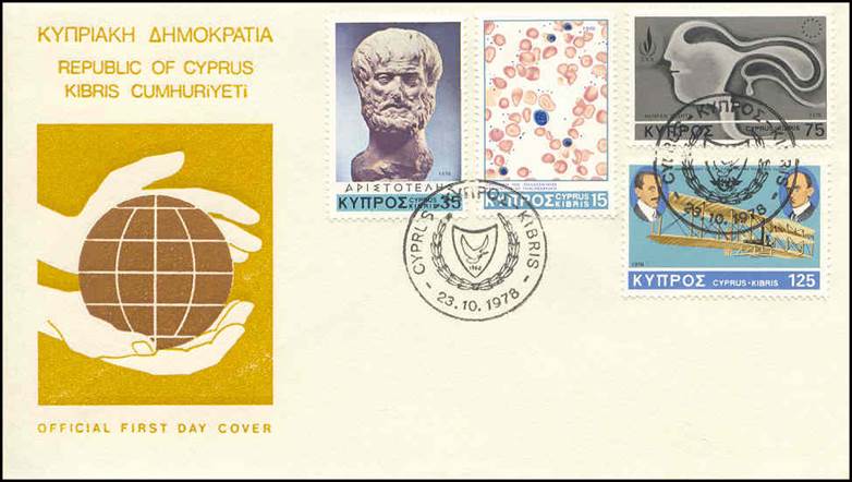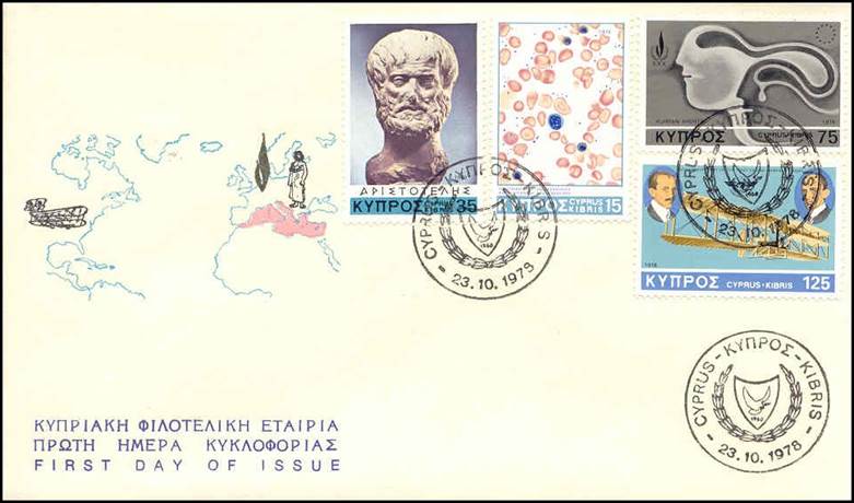 First Day Covers (FDC), showing the four stamps of this issue: 1. 15m.: Affected blood corpuscles with low hemoglobin - 5th Anniversary of the establishment of the Pan-Cyprian Anti-anemia Association for the Prevention of Thalassaemia or Mediterranean Anemia; 2. 35m.: Sculpture (Bust) of Aristotle – 2300th Death anniversary of Aristotle; Roman copy in Vienna’s Museum of the bust of the great Greek Philosopher Aristotle (384-322 B.C.) 3. 75m.: Heads and Human Rights emblem – 25th Anniversary of the entry into force of the European Convention for the Protection of Human Rights and 30th Anniversary of the Universal Declaration of Human Rights; and 4. 125m.: 75th Anniversary of first powered flight.
