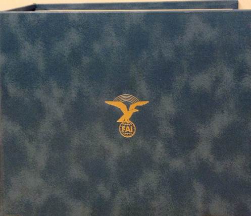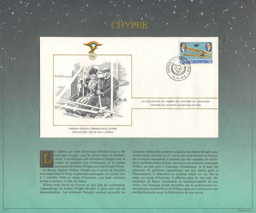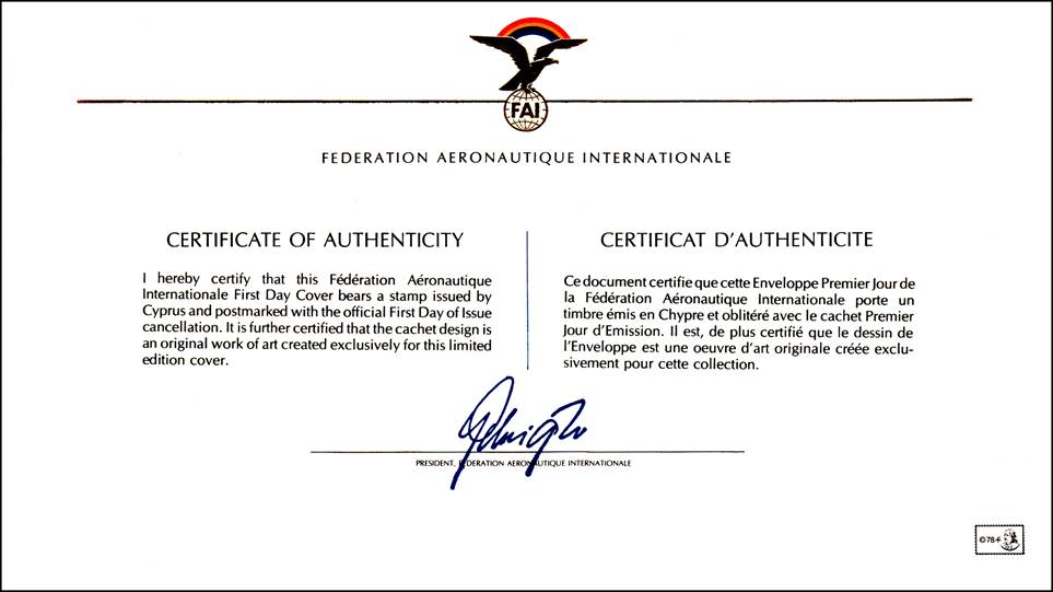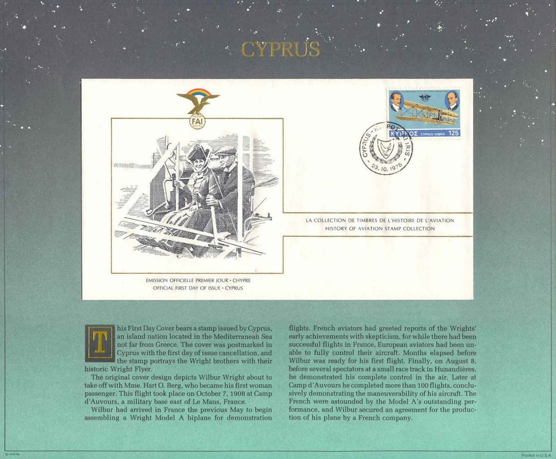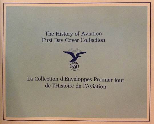 The above cover is part of the album “The History of Aviation - First Day Cover Collection” (“La Collection d’Enveloppes Premier Jour de l’Histoire de L'Aviation”) containing 110 different first day covers, from all over the world, issued in commemoration of the 75th anniversary of the first engine-powered flight (1978), by The Franklin Philatelic Society under the auspices of FAI, the Fédération Aéronautique Internationale (International Aeronautical Federation), Lausanne, Switzerland. The collection is neatly arranged in a blue embossed binder with the cover page showing the FAI emblem. Each illustrated stamped envelope has descriptions in French and English. The frame of the picture (related to the Wright Brothers) on the cover is in gold and extends to form another rectangular box across the front of the envelope where the address would normally be written. Inside this box written in French and English is History of Aviation Stamp Collection. Postally marked on cover describing the event. On the back of the envelope is the same FAI symbol in gold that reads underneath FÉDERATION AÉRONAUTIQUE INTERNATIONALE. Beneath that, there are two paragraphs, one in French and one in English that espouse the Certificate of Authenticity. At the bottom of the envelope is the signature of Mr. Adolf „Pirat“ Gehriger, the President of FAI between 1977 and 1978. The cachet design (original art) of the lot of first day covers reports various feats of the Wright Brothers. Note that a similar album exists with texts in German and titled “Die Geschichte der Luftfahrt”.