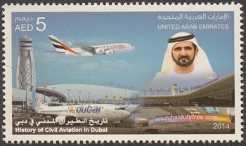 The Dubai Duty Free (DDF) opened for business on 20 December 1983. In addition to the picture of Sheikh Mohammed bin Rachid Al Maktoum, this stamp shows Al Maktoum International Airport opened on 27 June 2010 in the main part of Dubai World Central, and two aircraft: an Airbus A380 from Emirates airline and a Boeing 737-800 NextGen from FlyDubai airline. FlyDubai was established as Dubai’s first low-cost airline on 1 June 2009.