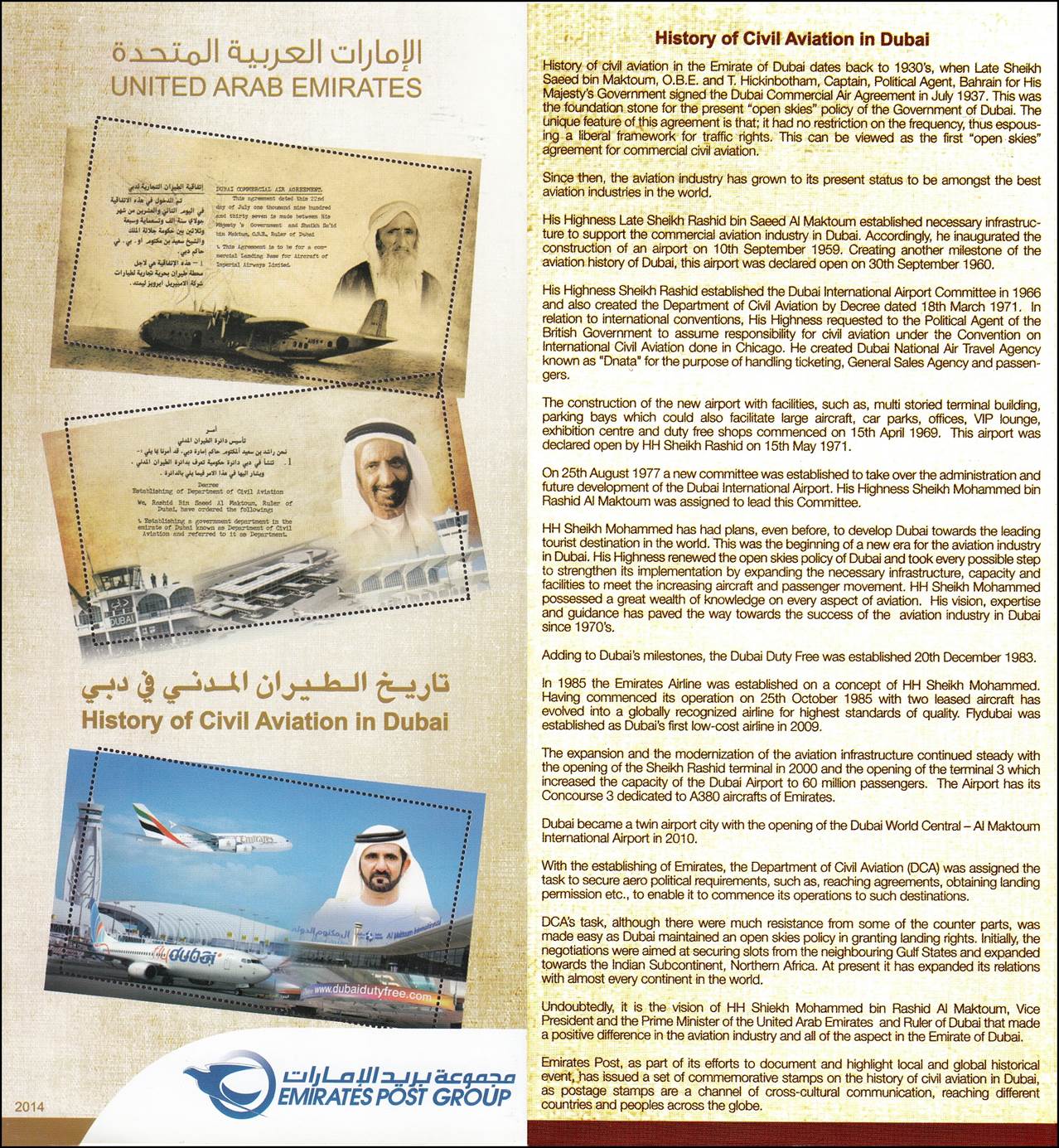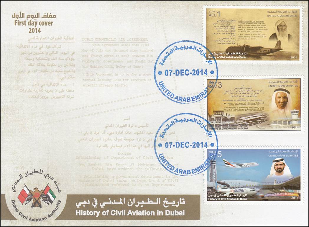 Background : The Emirate of Dubai (part of the United Arab Emirates, UAE) issued a set of 3 stamps and a related first day cover, both released on 7 December 2014 to highlight Civil Aviation’s History in Dubai during a first-day ceremony coinciding exactly with the 70th anniversary of the signature of the Chicago Convention and the 20th anniversary of the International Civil Aviation Day. Significant events are reflected in the themes of these special postage stamps released by the Emirates Post (Empost), in collaboration with the Dubai Civil Aviation Authority (DCAA). The stamps celebrate Dubai’s inspiring civil aviation growth and development since 1937, when it became the first in the world to pursue what is now known as Open Skies policy as a result of signing the Dubai Commercial Air Agreement. The UAE is a Member State of ICAO since 25 April 1972. These postal stamps reflect the significant developments that took place during the three eras that converged the wonderful journey of civil aviation in Dubai from the creek leading towards establishing a twin-airport city and taking its airlines, Emirates and Flydubai, to greater heights besides other areas of the aviation industry. In addition to the release of the postal stamps, Dubai paid tribute to the drafters of the Chicago Convention, the International Civil Aviation Organization and its officials and to all the States for their contribution towards the development of international civil aviation for the benefit of the people and to preserve friendship and understanding amongst nations. During this occasion, DCAA also released a special edition of its monthly bilingual newsletter, Via Dubai dedicated to the 70th Anniversary of the Chicago Convention.