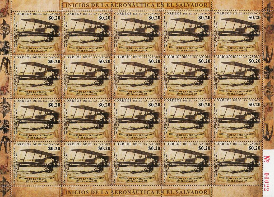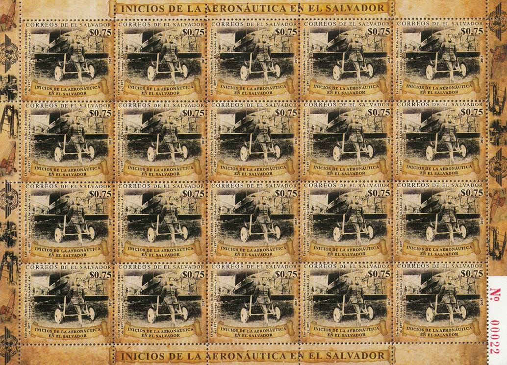 The stamps allude to the beginnings of Aeronautics in El Salvador, as follows: 1. $0.05: 70th anniversary of the ratification of the Chicago Convention and the admission to ICAO. See more information here-below as regards the ratification of the Chicago Convention by El Salvador and the Civil Aviation Authority. 2. $0.10: Aircraft transporting postal bags in 1928. On a background of clouds, the aircraft looks like a Waco S series (but there is some incoherence, as the Waco company began producing closed-cabin biplane models only after 1930). Aircraft flying the country’s flag. See more details on the flag here-below. It is to be noted that, during the presidential term of Pío Romero Bosque (March 1927 to March 1931), four WACO aircraft were acquired in 1929, two of the "Taperwing" type and two "F" models. 3. $0.20: Airplane of Father Domingo de Lara. In 1885, the priest José Domingo de Lara, was one of the experimenters of aviation in El Salvador, emulating the Wright brothers. Father Domingo de Lara built a wooden and fabric device (glider or plane), which was launched for the first time from a tower in the neighborhood of the San Jacinto church in San Salvador, successfully landing in a nearby park. Later he modified his device, managing to fly from a peak to what is now known as the National Zoological Park, covering a distance of approximately 1600 meters. This is how the Salvadoran aviation was born. 4. $0.75: Enrico Massi (1897-1923) and his airplane. Pioneer of aviation in El Salvador, Enrico Massi standing in front of a Spad S.XIII biplane fighter during the First World War. He greatly contributed to the formation of aviation in El Salvador. Born in Naples, Italy, after serving as Navy Italian pilot during World War I, Massi became Flight instructor. In the 1920s, he founded the National Aviation School in Honduras and then went to El Salvador, where he created the country's military flying school.