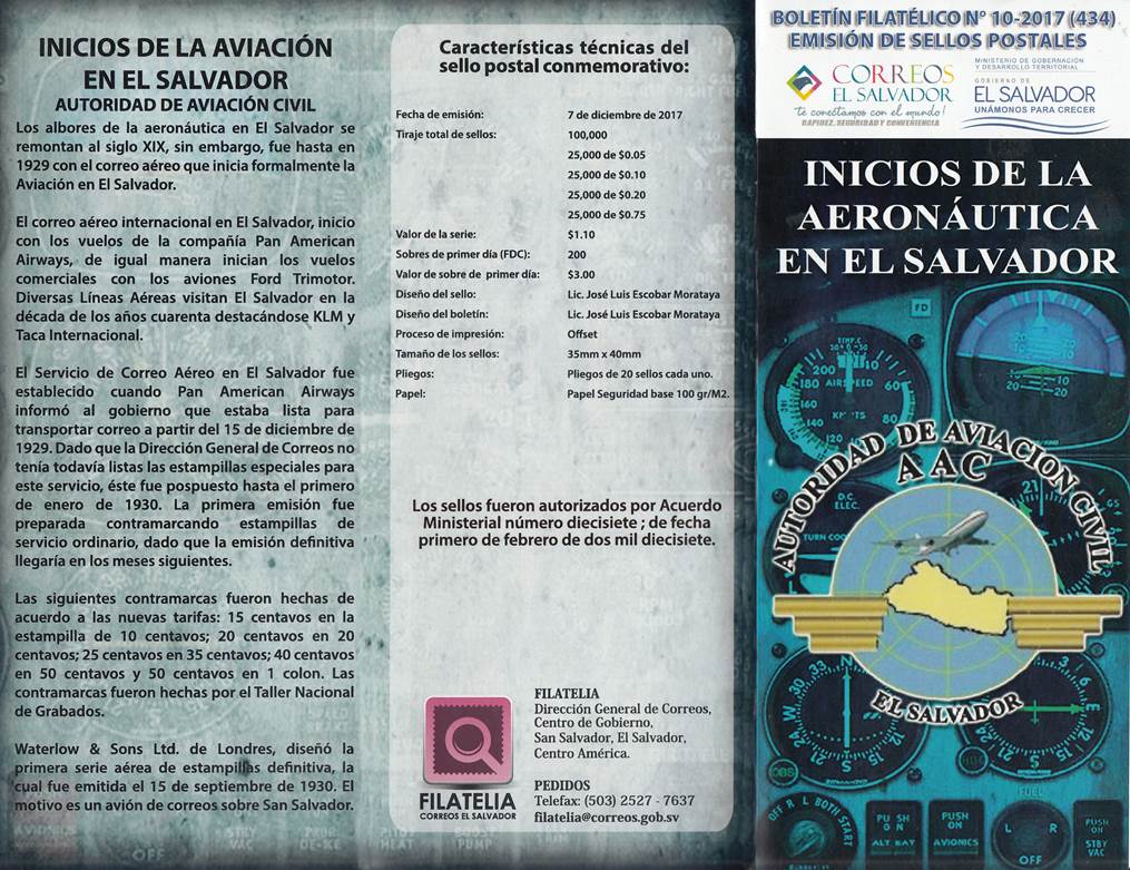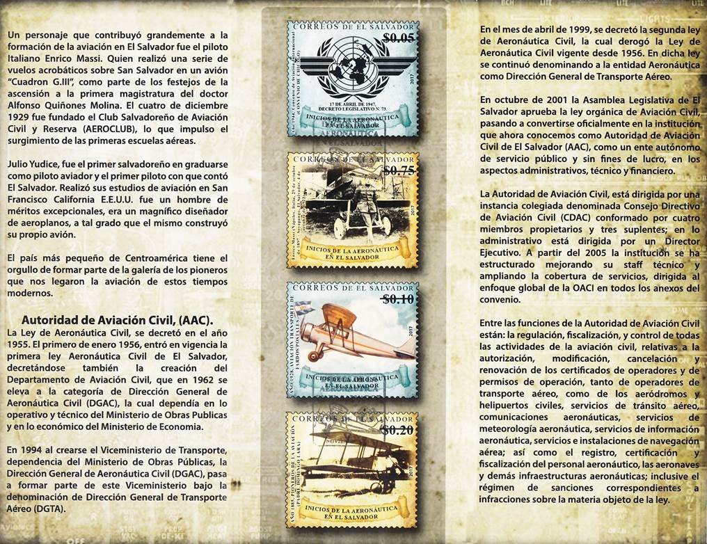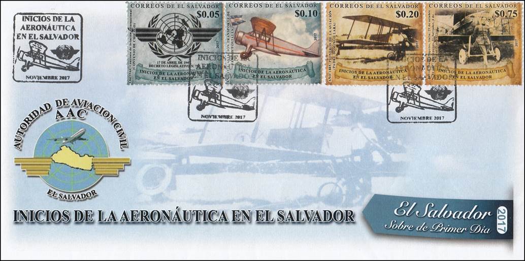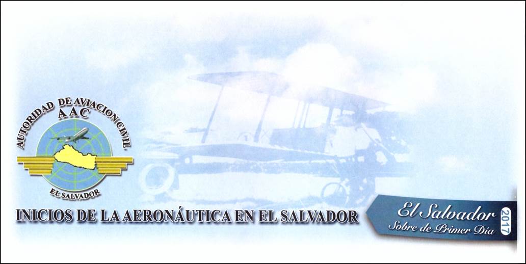 Official First Day Cover (Recto and Verso), with sequential number. 200 copies were issued. Father Domingo de Lara’s plane in the background and DGCA’s emblem (Autoridad de Aviación Civil, ACC). The cancel displays the aircraft of $0.10 stamp and ICAO emblem. Note that the cancel indicates "NOVIEMBRE 2017", without specifying the day. On 19 November 2015, the Civil Aviation Authority (CAA) held the first Aeronautical Fair, which brought together some 26 companies and training centers related to national aeronautics; the objective of this activity was to promote, develop and create opportunities that allow the growth of the aeronautical industry in the country, with a view of creating a regional cluster. The third edition of this fair was held on 1 November 2017; this most likely explains why the cancel bears the month of November 2017.