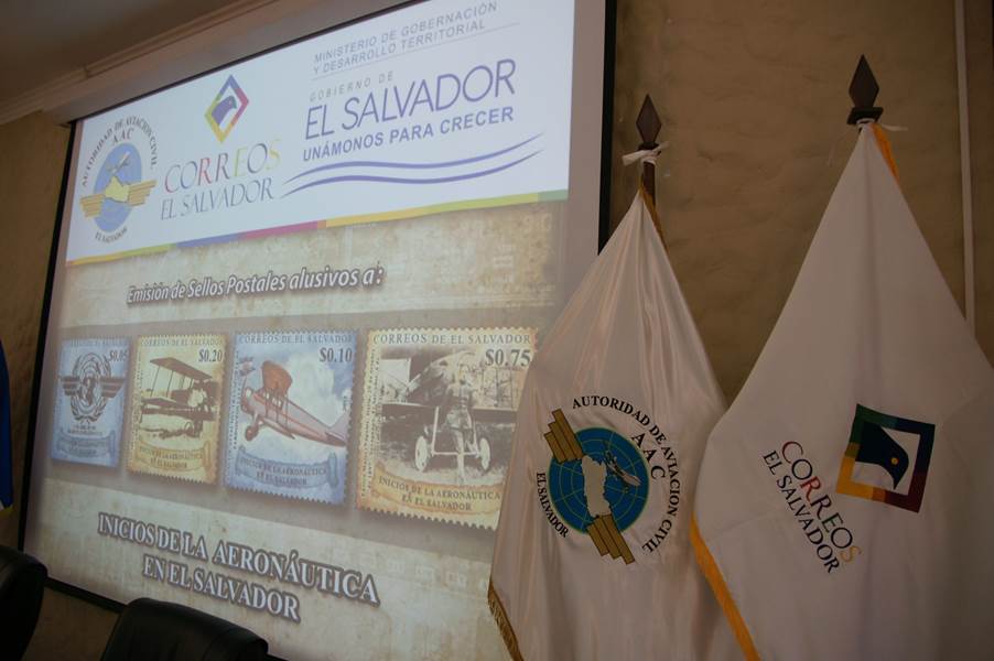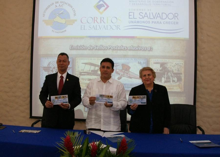 The First Day Ceremony (see picture here-below) was held within the framework of the International Civil Aviation Day, celebrated every year on 7 December. The table of honor was chaired by (from left to right): Lic. Aristides Valencia, Minister of Interior; Coronel René Roberto López, President of the Aviation Authority; and Lcda Margarita Quintanar de Ortez, General Director of the Post Office.