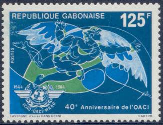 Gabon – 01 December 1984 40th Anniversary of ICAO The artist name is printed Herni instead of Erni. |