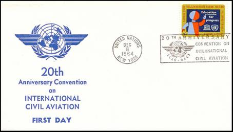 United Nations - 20th Anniversary of ICAO First Day Cover The United Nations postmark was dated 8 December 1964, instead of 7 December 1964. |