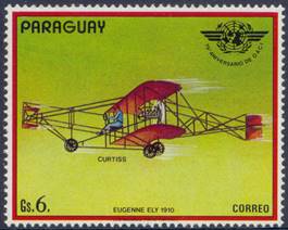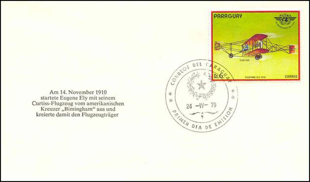 Paraguay – 24 April 1979 History of aviation – 75th Anniversary of civil aviation – 35th Anniversary of ICAO Although the stamp shows an error in the first name of the pioneer Eugene Ely (Eugenne with two n-letters), the text in German on the left side of this cover shows the correct spelling in the first name.