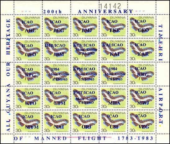 Guyana – 26 October 1984 - 40th Anniversary of ICAO Sheetlet of 25 stamps – The original stamps were overprinted twice. The first overprint was for the bicentennial of first manned flight (1783‑1983) and the 20th anniversary of Guyana Airways. The second overprint was for the 40th anniversary of ICAO. Mont Golfier should be written in one word: Montgolfier. Note that the overprinted three-letters correspond to IATA airports codes in Guyana.