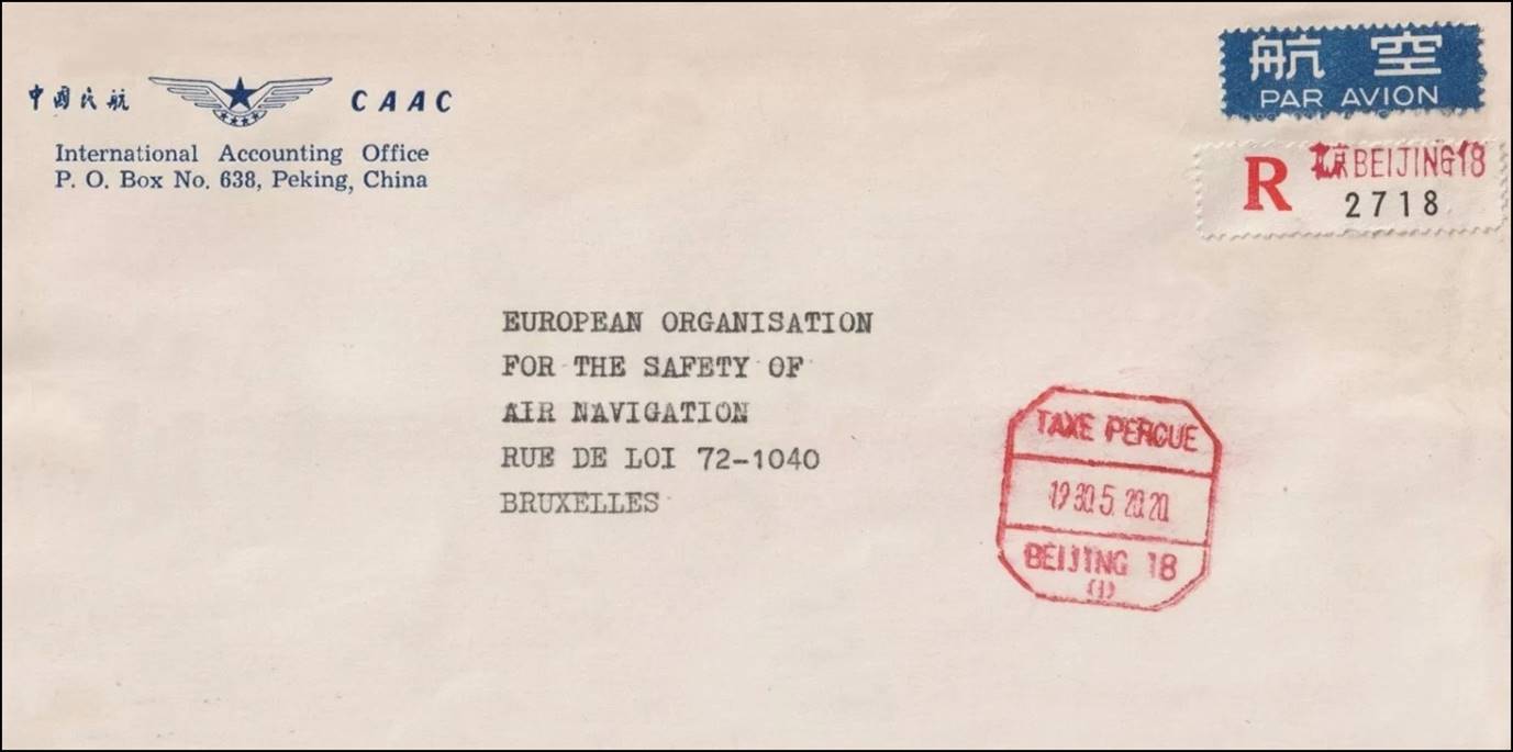 Cover sent from Peking (now Beijing), China to the European Organization for the Safety of Air Navigation (EUROCONTROL) in Brussels, Belgium.