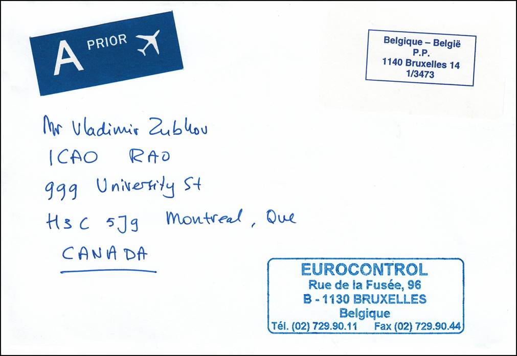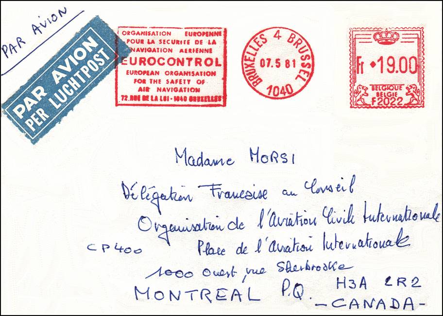 Cover sent from EUROCONTROL to the French Delegation at ICAO – Postmarked on 7 May 1981. The slogan indicates the location of prior headquarters at Rue de la Loi, Brussels.