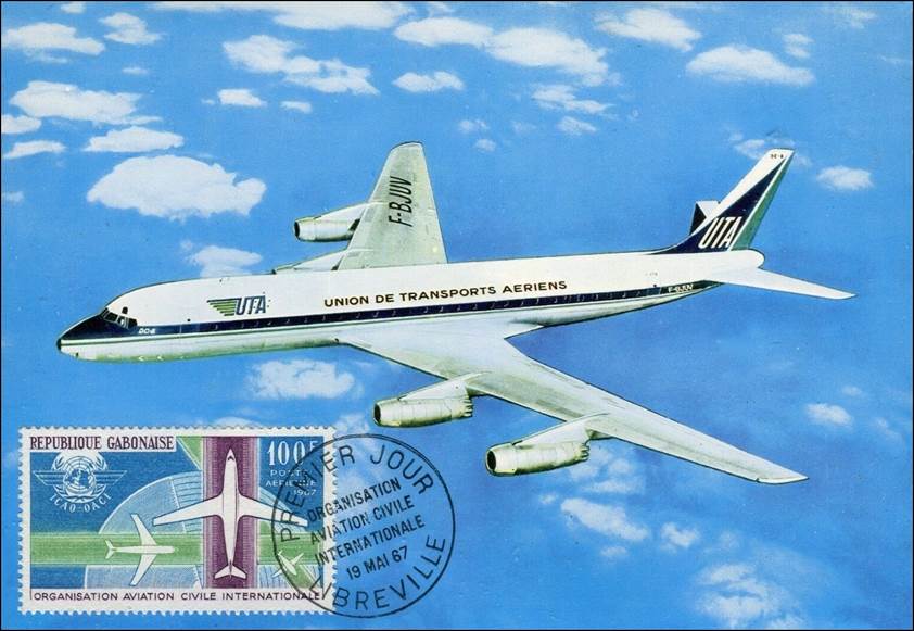 Maximum card (recto and verso) “Sous le ciel de Paris” by Michel Hamel. Douglas DC-8-30 registered F-BJUV of UTA (Union de Transports Aériens) airline. Owned previously by Transports Aériens Intercontinentaux (TAI), this aircraft was delivered to UTA in October 1963.