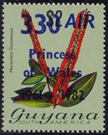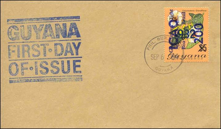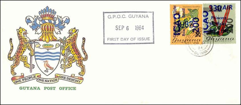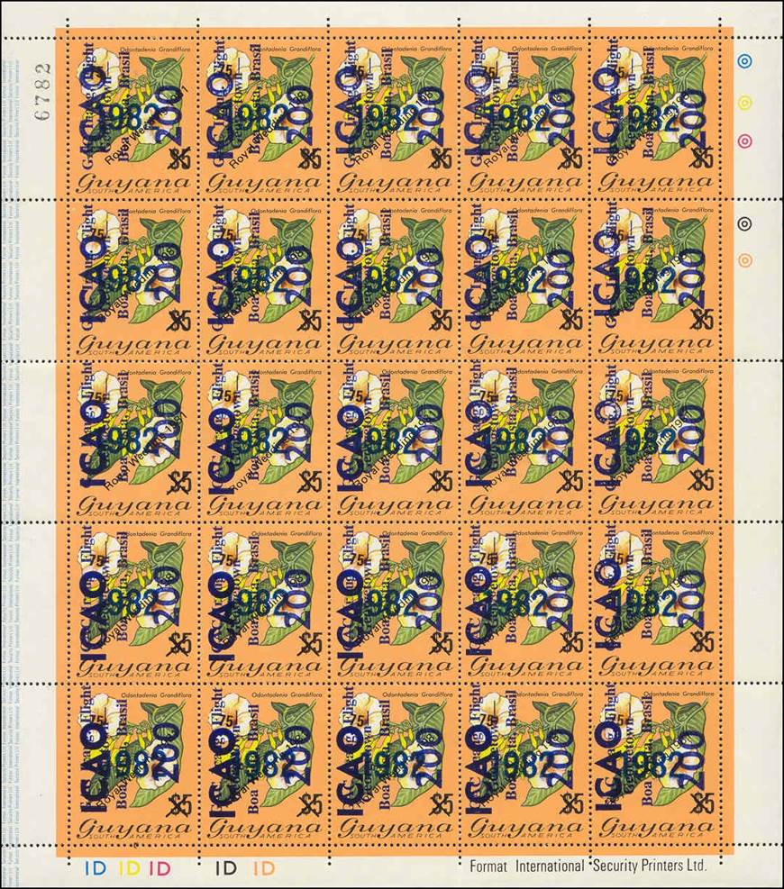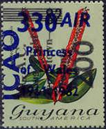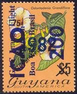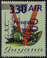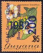 On 27/10/1982, the above stamp was overprinted as follows: vertical surcharge in black-blue with 200 and vertical overprint in blue with GAC Inaug. Flight / Georgetown‑ / Boa Vista, Brazil, for the first anniversary of the G.A.C. inaugural flight between Georgetown, Guyana, and Boa Vista, Brazil.
