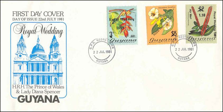 First Day Cover - Royal Wedding of the Prince of Wales and Lady Diana Spencer - C.D.S. (circular date stamp) of 22 July 1981. The three stamps shown on this cover were overprinted and surcharged on that date.