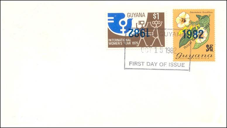 First Day Cover issued on 15 October 1982 showing the horizontal overprint 1982 in black-blue on the Odontadenia Grandiflora stamp and the inverted overprint 1982 on the stamp issued on 1 July 1975 for the International Women's Year. |
