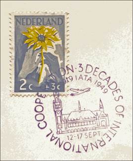 1949 - Cancel commemorating the 30th anniversary of the creation of IATA and showing the Peace Palace situated at The Hague, Netherlands |