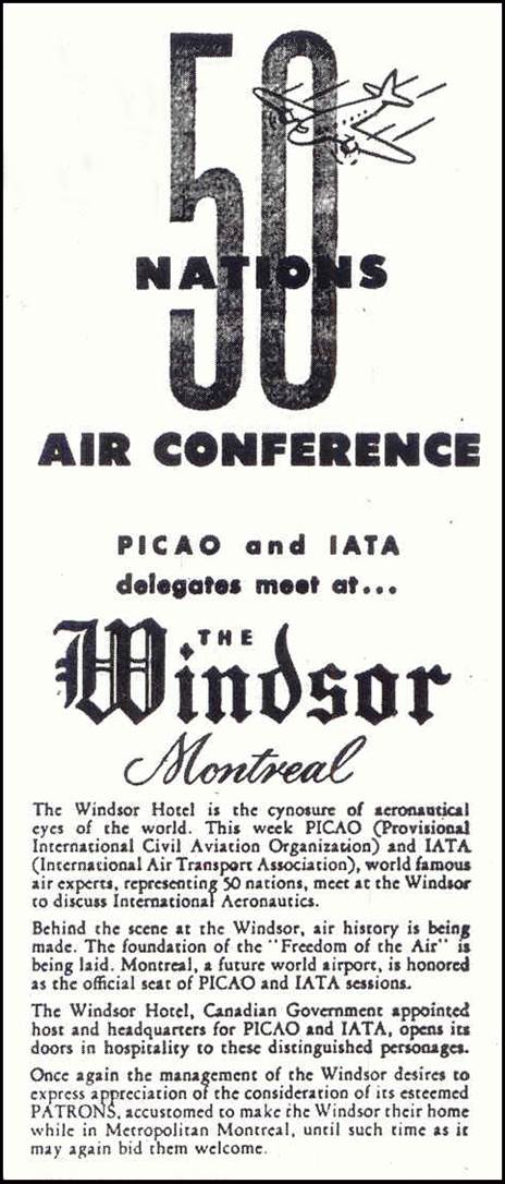 Advertisement published in the newspaper The Gazette on 15 October 1945, welcoming the first Annual General Meeting held at the Windsor Hotel in Montreal. |