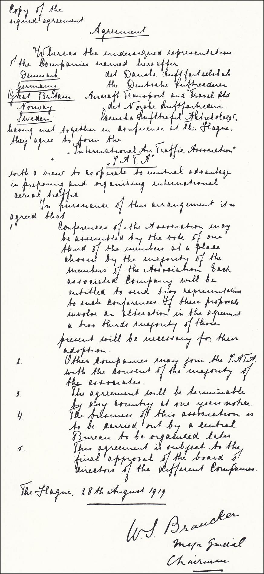 Copy of the short agreement signed at the organization meeting of IATA at The Hague on 28 August 1919. It bears the signature of the chairman of the session, Major General Sir W. Sefton Brancker, who represented Aircraft Transport and Travel, Ltd.