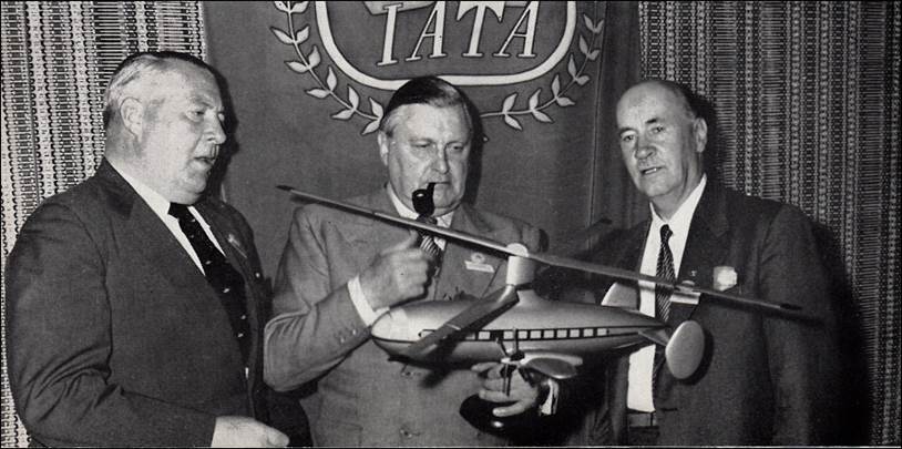 From left to right: J.C. Kelly-Rogers of Air Lingus; Lord Douglas of Kirtleside, BEA Chairman; Igor Sikorsky. Picture taken in 1949. In the background, IATA emblem used from 1934 until the early 1950s.