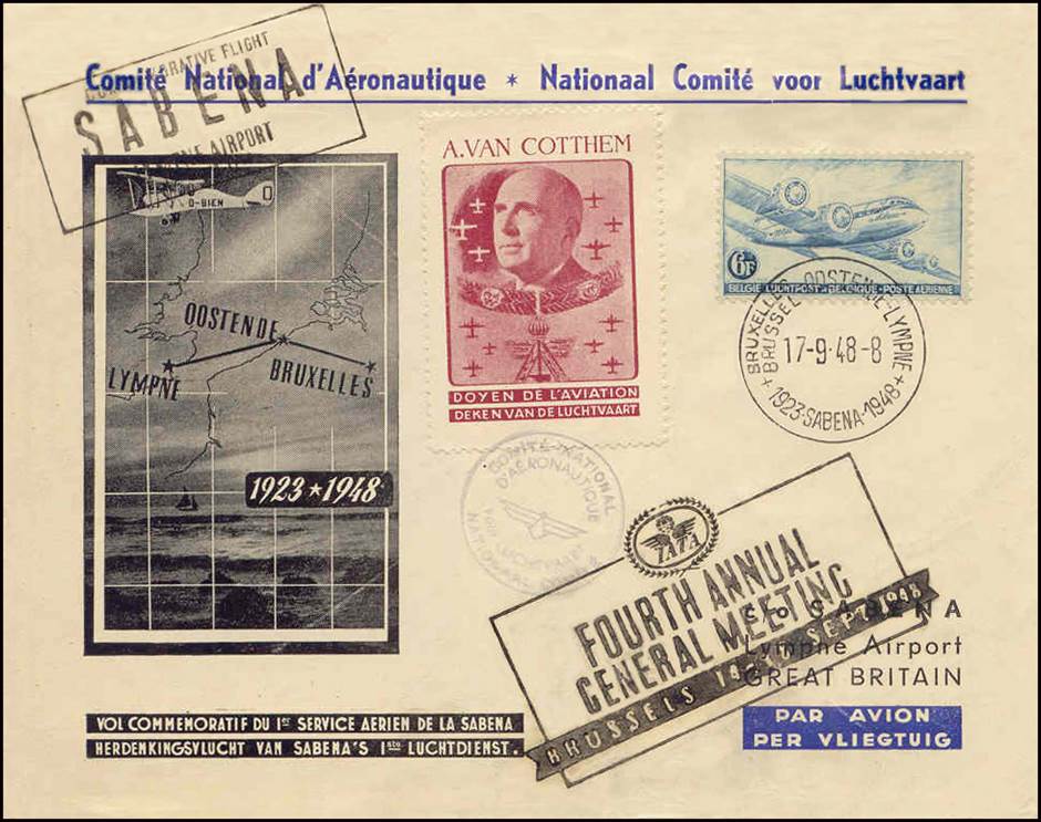 IATA 4th Annual General Meeting held in Brussels, Belgium, from 14 to 18 September 1948. It shows the emblem used by IATA at that time. Postmarked on 17 September 1948. The cover (see above picture and the special insert) was issued for the 25th anniversary of the Belgian airline SABENA, Société Anonyme Belge d’Exploitation Aérienne, founded on 23 Mai 1923, which succeeded SNETA (the Syndicat National pour l'Étude des Transports Aériens, formed in 1919, was the first air transport organization in Belgium) and acted as the Belgian national flag carrier. On the day of its foundation and as shown by the cachet, the inaugural flight with a load of freight and mail went from Haren (Brussels) via Ostend to Lympne in the UK, carried by an Airco (de Havilland) D.H.9 aircraft (ex-bomber aircraft c/n RAF F1293, used by SNETA between March 1920 and July 1931 and registered O-BIEN in 1923, reregistered OO-IEN later in 1929 and dismantled after its Belgian commercial career in 1945). The blue-grey stamp depicts a SABENA Douglas DC-4 (registered OO-DAA); a label in honour of Albert Van Cotthem (1890-1962), officially recognized as the Dean of Belgian Aviators, is affixed.