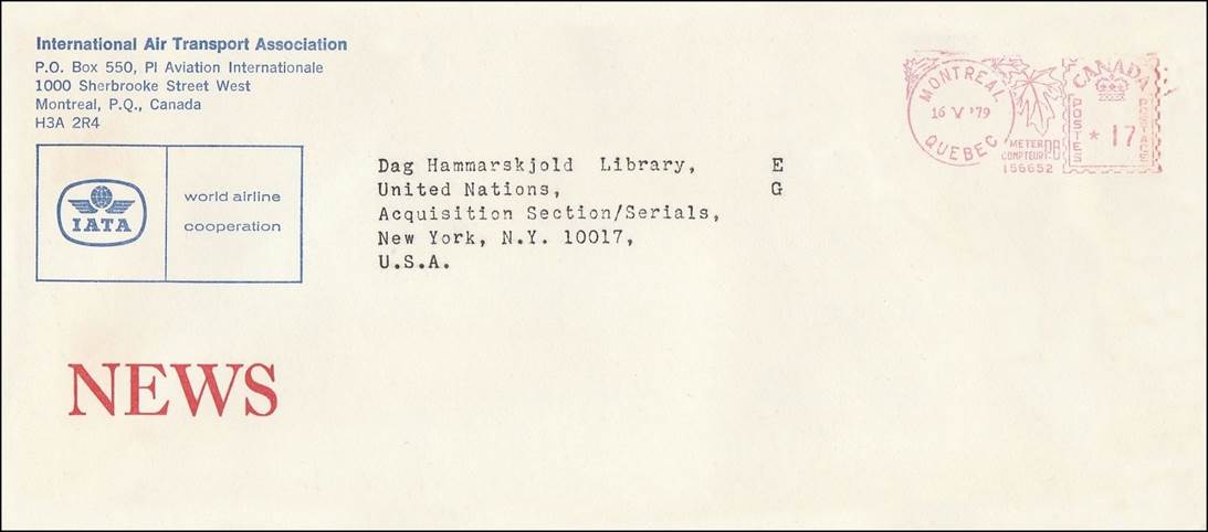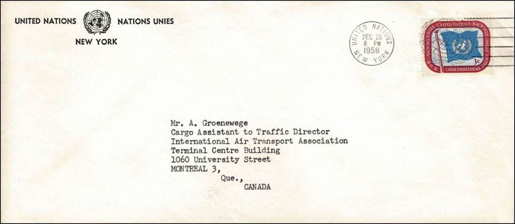 Cover sent from UN New York to Adrianus Groenewege, Cargo Assistant to the Traffic Director at IATA. Postmark dated 28 December 1958. Whereas ICAO occupied the six upper floors (from the 5th to the 10th inclusive) of the building located at 1080 University Street, the headquarters of IATA occupied the 2nd floor in the same building (with postal number 1060 University Street). Photo credit : The Journal of the United Nations Philatelists, Vol. 49 #4, August 2025.